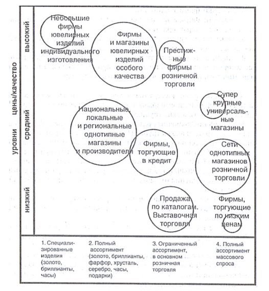 Рис. 12. Стратегические группы конкурентов в ювелирном бизнесе (из кн.[43]: Экономическая стратегия фирмы / Под ред. А.П. Градова/ – СПб.,1999. – С. 78)