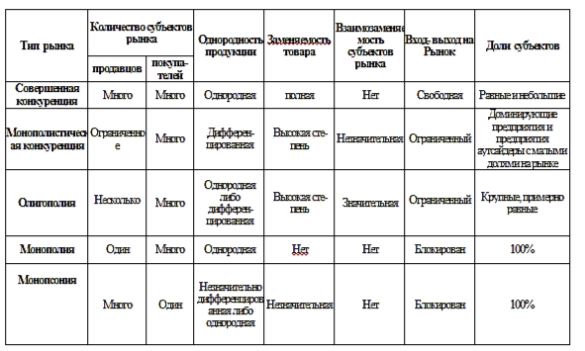 Если мы вернемся к классическому делению рынков на типы в экономической теории, то заметим, что их деление происходит по таким критериям, как: количество субъектов рынка, однородность продукции, заменяемость товара, взаимозависимость субъектов рынка, вход-выход на рынок, доли субъектов. При наличии этих критериев в экономической теории рынки делятся на: рынок совершенной конкуренции, рынок монополистической конкуренции, олигополию, монополию, монопсонию.