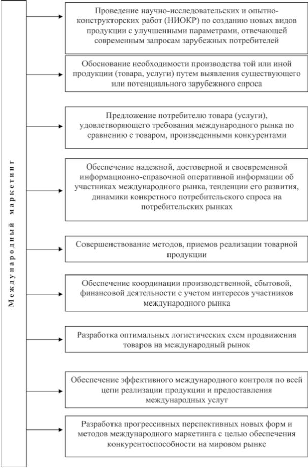 Следовательно, международный маркетинг является частью целевой стратегии фирмы и представляет собой самостоятельную область деятельности фирмы при выходе ее на международный рынок. В этой связи международный маркетинг можно охарактеризовать как важнейшую и неотъемлемую часть стратегии фирмы по освоению международного рынка, осуществляемую свою деятельность более чем в одной стране. В обобщенном виде международный маркетинг представляет собой взаимосвязанный комплекс мероприятий фирмы по осуществлению внешнеэкономической деятельности на мировом рынке.