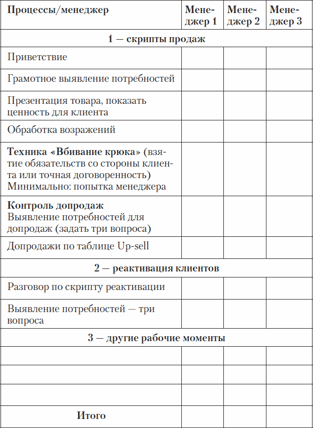 Но даже этого недостаточно. Использование и соблюдение скриптов необходимо контролировать. Большинство компаний ведут запись телефонных разговоров, но не прослушивают их или прослушивают время от времени. Возможно, вы тоже из их числа. Чек-лист эффективности телефонных звонков необходим для контроля работы менеджеров. В нем прописывают все блоки скрипта, благодаря чему оценить качество телефонных разговоров ваших сотрудников может даже непрофессионал, например фрилансер. Ему достаточно отметить галочкой/плюсиком, какой блок был пройден, а какой – упущен.