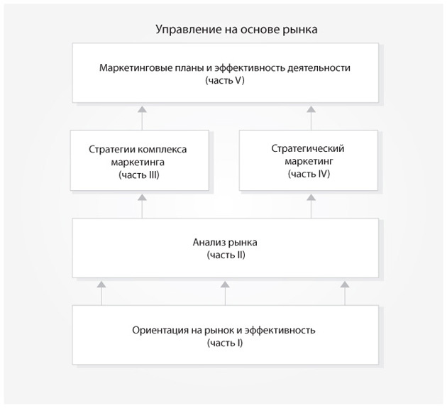 В данной модели представлены как логика управления на основе рыночных требований, так и структура книги. Ориентация на рынок и эффективность маркетинга (часть I) – основа анализа рынка (часть II) с учетом оценки потребностей клиентов, тенденций развития рынка и конкуренции. Приверженность рыночной направленности и непрерывный его анализ позволяют разработать сфокусированные стратегии комплекса маркетинга (часть III) и стратегического маркетинга (часть IV). Кульминация работы – маркетинговые планы и эффективность деятельности (часть V).