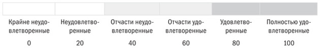 Оценить удовлетворенность клиентов можно разными способами. Наиболее распространенный – индекс потребительской удовлетворенности (ИПУ). Он рассчитывается на основе оценок общей удовлетворенности по 6-разрядной шкале, начиная с крайне недовольных и заканчивая полностью довольными клиентами. Как можно заметить, каждому уровню потребительской удовлетворенности присваивается рейтинг от 0 (для крайне неудовлетворенных) до 100 (для полностью удовлетворенных).
