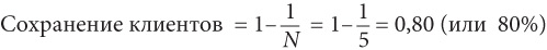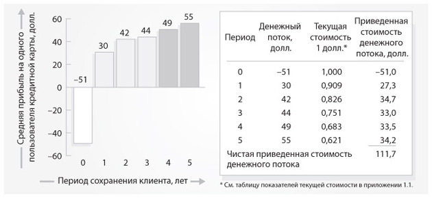 На рисунке 1.10 показана средняя прибыль в расчете на одного пользователя кредитной карточки за пятилетний период. Открытие счетов для новых пользователей принесло чистый годовой убыток 51 долл. с клиента. Привлеченные недавно клиенты тоже не торопятся активно использовать свои новые кредитки: они приносят среднюю прибыль 30 долл. за первый год, 42 долл. за второй и 44 долл. за третий. На пятый год средняя прибыль от обладателя карты составляет 55 долл. Таким образом, ценность пользователя растет со временем. Торгующей по кредиткам компании весьма невыгодно терять покупателя на пятый год из-за его неудовлетворенности. Цена его ухода в первый год составит 106 долл. (55 долл. – упущенная выгода, связанная с уходом, и 51 долл. – затраты на привлечение нового клиента). В этом примере средняя продолжительность обслуживания клиента составляет 5 лет. Итого коэффициент сохранения клиентов 80 %.