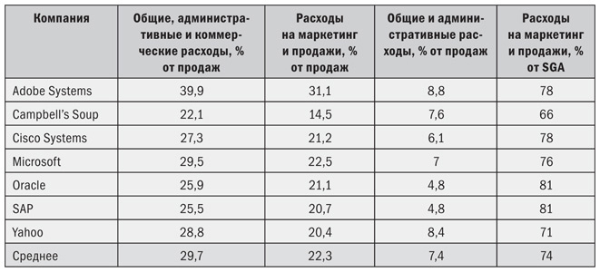 В отчетности большинства корпораций расходы на маркетинг и продажи включены в общую сумму коммерческих, общих и административных расходов. Семь компаний, показанных в табл. 2.6, указывают в своей отчетности расходы на маркетинг и продажи отдельно от остальных расходов. Информация по этим компаниям позволяет нам хотя бы частично оценить долю расходов на маркетинг и продажи для остальных, не предоставляющих детальной отчетности. Доля маркетинговых расходов в структуре общих и административных расходов для этих компаний варьирует от 66 до 81 %, а среднее значение составляет 74 %. Когда компания не указывает величину расходов на маркетинг и продажи, мы рекомендуем использовать для расчетов разумное значение на уровне 75 %.