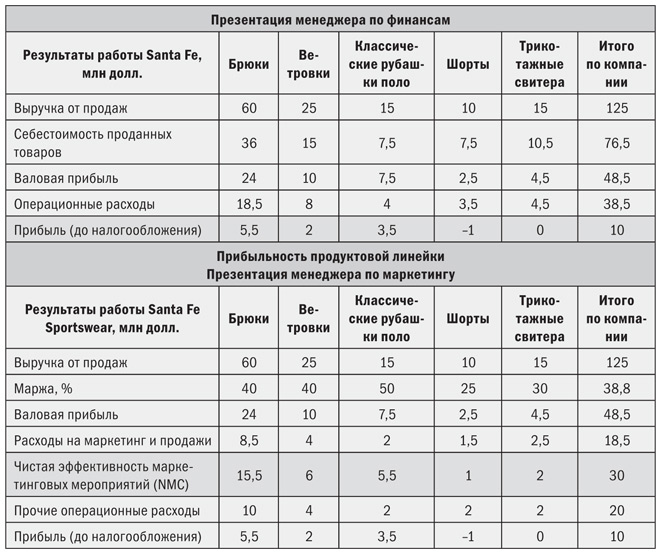 Компания Santa Fe Sportswear производит пять товарных линеек спортивной одежды, общий объем продаж которых составляет 125 млн долл. В целом компания была рентабельна, но две линейки продавались плохо. Тогда высшее руководство cобралось для рассмотрения эффективности работы. Финансовый менеджер подготовил для обсуждения сводку по рентабельности товарных линеек, представленную в первой части табл. 2.7, и планирует использовать следующий аргумент.