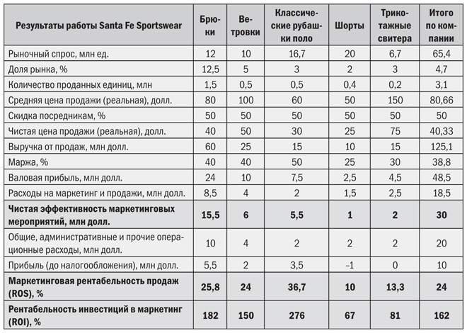 Наш расчет чистой эффективности маркетинговых мероприятий для продуктовой линейки брюк Santa Fe Sportswear будет выглядеть примерно так: