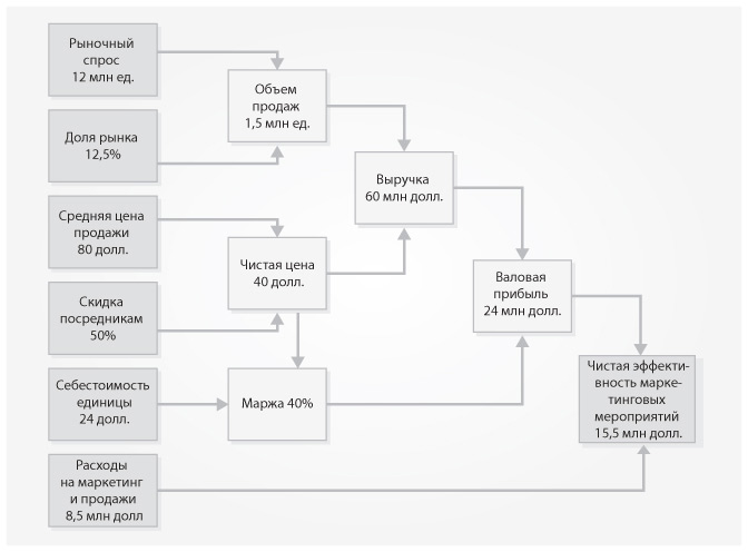 Чистая эффективность маркетинговых мероприятий = Рыночный спрос ? Доля рынка ? Средняя цена продажи ? Скидки для посредников ? Маржа в процентах – Расходы на маркетинг и продажи = Выручка ? Маржа в процентах – Расходы на маркетинг и продажи.