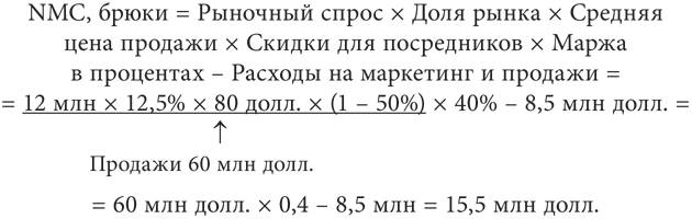 Посмотрим стратегически на чистую эффективность маркетинговых мероприятий в продуктовой линейке брюк Santa Fe Sportswear. Как показано в табл. 2.8 и на рис. 2.8, выручка в размере 60 млн долл. – производное от величины рыночного спроса (12 млн ед.), доли рынка (12,5 %), средней цены продажи (80 долл.) и скидок посредникам (50 %). С учетом средней маржи на уровне 40 % продуктовая линейка приносит валовую прибыль в размере 24 млн долл. Исключив из величины валовой прибыли затраты на маркетинг и продажи (8,5 млн долл.), мы получаем величину чистой эффективности маркетинговых мероприятий на уровне 15,5 млн долл.