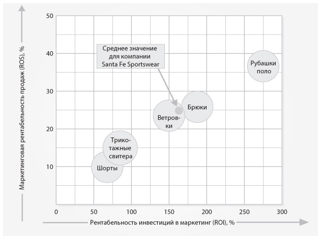 Маркетинговая рентабельность продаж (ROS) для брюк составляет 25,8 %, а рентабельность инвестиций в маркетинг (ROI) – 182 %. Оба показателя находятся на уровне выше среднего для всех продуктовых линеек ROS (24 %) и ROI (162 %). Как показано в табл. 2.8 и на рис. 2.9, продуктовая линейка брюк на втором месте по этим двум показателям прибыльности маркетинга. Лучшей стала линейка классических рубашек поло: ROS равна 36,7 %, а ROI – 275 %. У линейки шорт самые низкие значения этих показателей.
