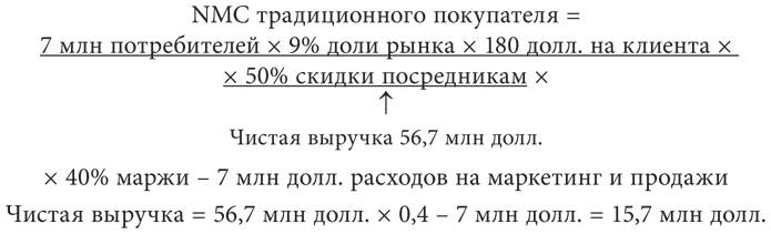 Рассмотрим результаты работы Santa Fe Sportswear в сегменте традиционных покупателей (табл. 2.9). Традиционные покупатели обеспечили NMC на уровне 15,7 млн долл., возникшую при выручке от продаж 56,7 млн долл., марже 40 % и 7 млн долл. расходов на маркетинг и продажи. Выручка от продаж представляет собой результат рыночного спроса: 7 млн потребителей, 9 % доля рынка, средняя выручка на клиента 180 долл. и 50 % скидки посредникам.