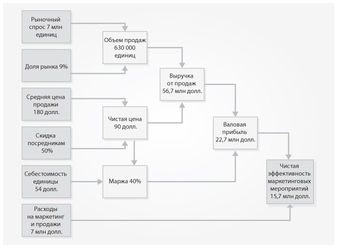 На рисунке 2.11 показано, как объединяются разные элементы уравнения при расчете чистой эффективности маркетинговых мероприятий для сегмента традиционных покупателей. Стратегия для повышения прибыльности маркетинга традиционных покупателей могла бы обратиться к рыночному спросу, доле рынка, выручке на клиента, скидкам для посредников, переменным издержкам, влияющим на величину маржи, расходам на маркетинг и продажи или любой комбинации этих факторов. Теперь мы готовы обсудить рыночные стратегии, предложенные на рис. 2.10, и оценить, как каждая из них может повлиять на прибыль Santa Fe Sportswear.
