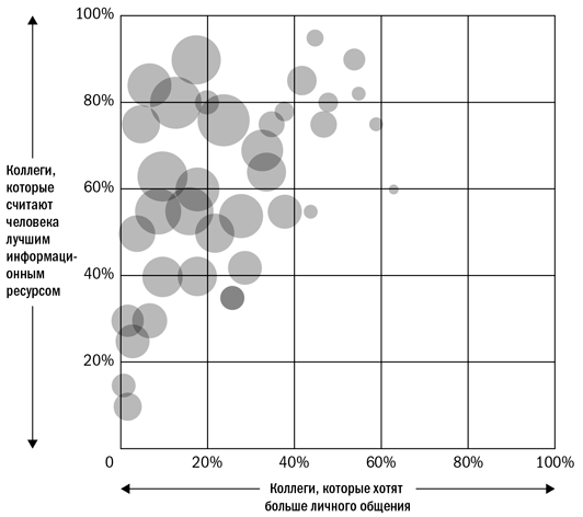 Рассмотрим тематическое исследование, полученное от процветающей фирмы по оказанию профессиональных услуг из списка «голубых фишек». Когда мы построили граф запросов к группе ключевых сотрудников, обнаружилось, что ведущий работник, назовем его Вернелл, имел 95 связей, основанных на входящих запросах. Но только 18 % из тех, от кого они исходили, сказали, что им нужен более личный подход к нему для достижения своих деловых целей, а остальных устраивали социальные и информационные ресурсы, предоставленные этим работником. Вторым номером в списке популярных работников стала Шерон с 89 связями, но ее ситуация выглядела совсем иначе и более опасно, так как 40 % этих людей хотели провести с ней больше времени, существенно влияя на ее личные ресурсы.