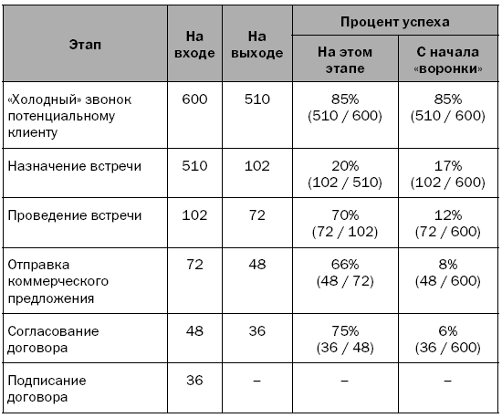 Цифра в четвертом столбце означает процент клиентов, успешно прошедших именно через этот этап (на профессиональном языке это называется «процент конверсии» или просто «конверсия»). Цифра в пятом столбце – процент клиентов, добравшихся от начала «воронки» до конца этого этапа.