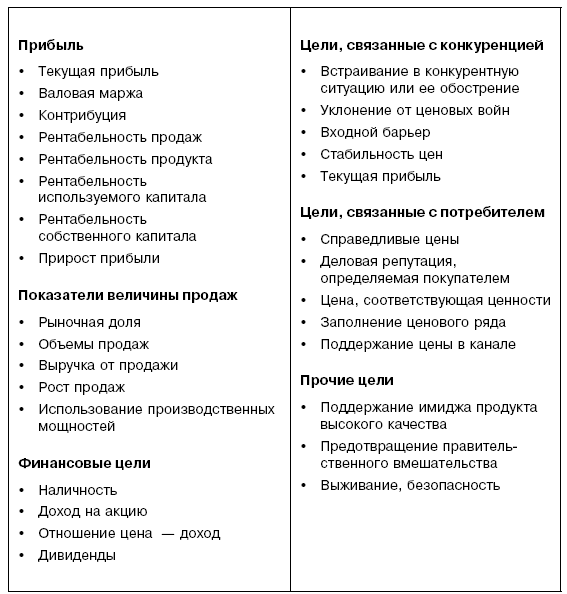 Чем более детально продуман этот вопрос для каждой ассортиментной позиции компании, тем лучше. Определение целей рассматривается как одна из центральных задач управления ценообразованием. Проблемы возникают, в частности, вследствие того, что необходимо конкретизировать общие цели развития бизнеса на уровне каждого ценового решения. Количественное измерение некоторых желаемых качественных состояний также требует дополнительных усилий. При этом существует необходимость согласования различных целей. Чем конкретнее уровень принятия решений, тем сильнее необходимость учета особенностей разных частей ассортимента, отдельных товаров, рынков, покупателей.