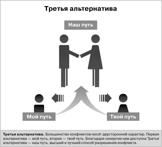 Но возможно другое развитие событий – вдохновляющее. Это случается, если я, глядя на вас, говорю себе: «Возможно, мы могли бы найти лучшее решение, чем то, которое видится каждому из нас в отдельности. Не поискать ли Третью альтернативу – ту, что прежде даже не приходила нам в голову?» Сомневаюсь, что кто-нибудь когда-нибудь задает такой вопрос. А ведь это ключ не только к разрешению конфликтов, но и к изменению будущего.