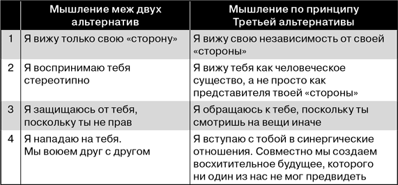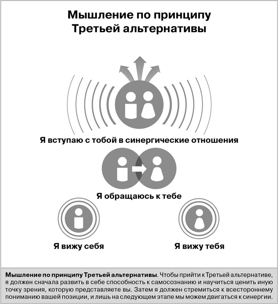 Если мы хотим присоединиться к ним, освоить мышление по принципу Третьей альтернативы, то должны внести в собственные парадигмы четыре масштабных изменения. Нужно усвоить, что они даются непросто. Они парадоксальны. Они уводят нас от эгоцентризма к подлинному уважению к другим. Они избавляют нас от необходимости снова и снова искать «правильный ответ», поскольку учат искать «лучший» ответ. Они увлекают нас на неизведанные пути – ведь никто заранее не знает, какова она, Третья альтернатива.