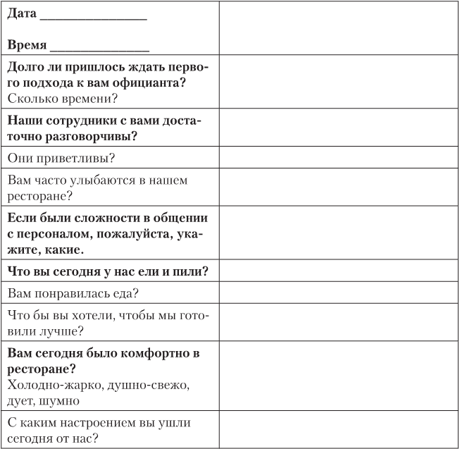 Хочу отметить, что это не бланк оценки качества сервиса. Это документ, в котором управленец в смену пытается фиксировать отношение гостя к обслуживанию в ресторане, реальные факты и свои ощущения. Цель – выявить моменты, которые создают у гостя ощущения дискомфорта.