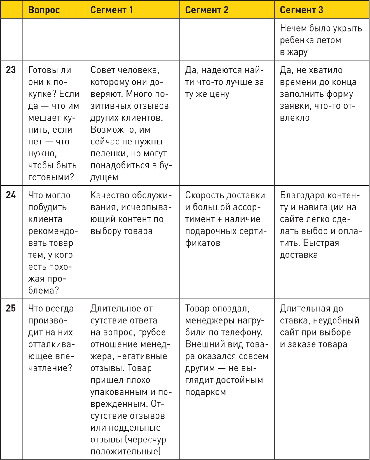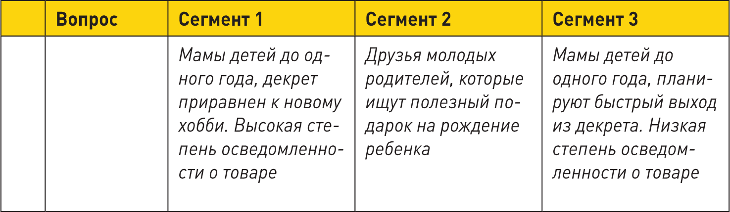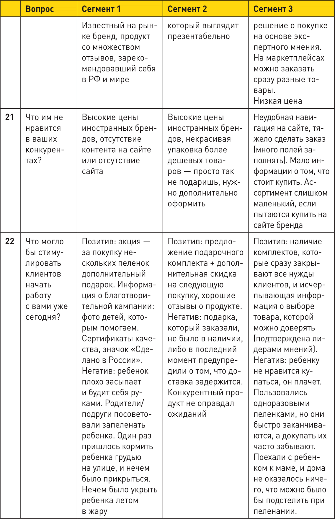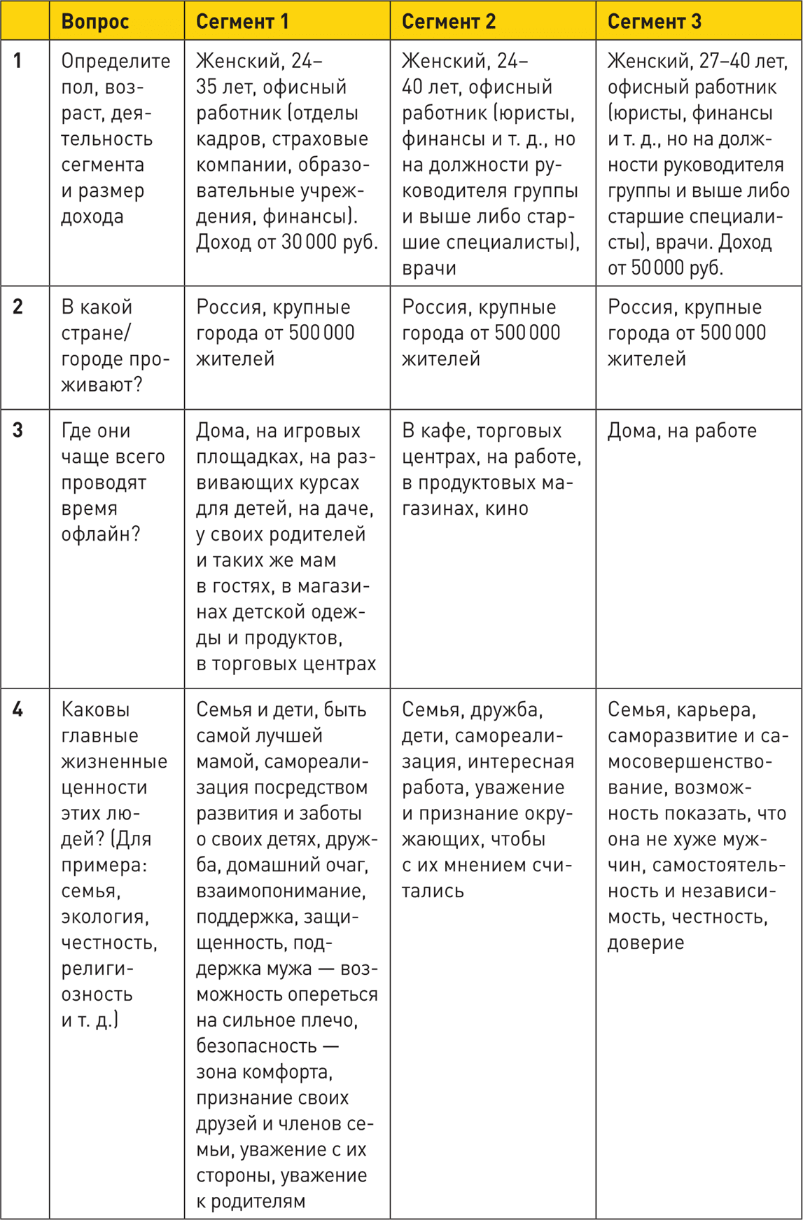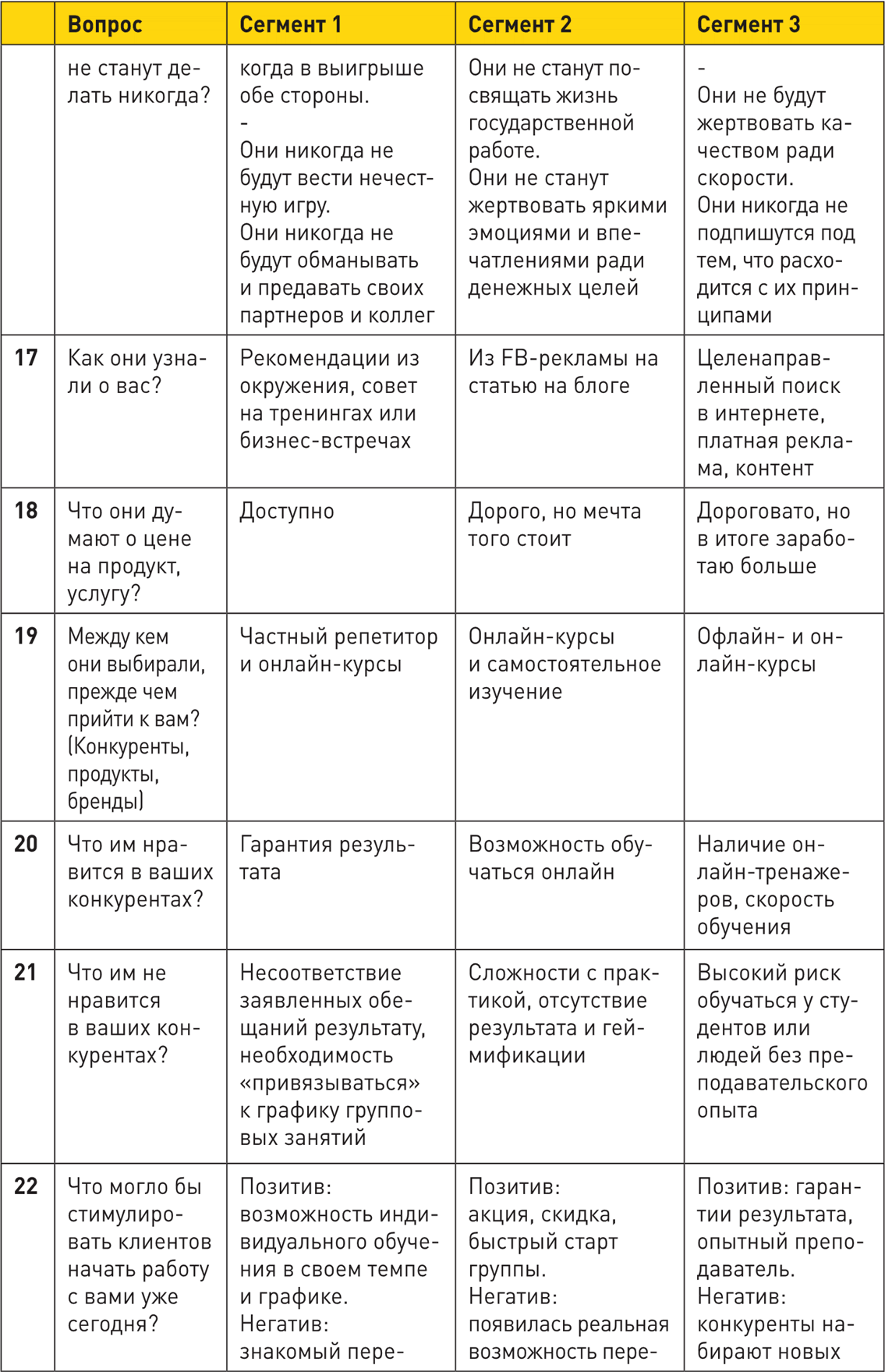 Категорически запрещается читать первый вопрос и по очереди отвечать на него в каждом из сегментов. Так вы не будете фокусироваться на их отличиях, и ответы получатся слишком общими. Вам необходимо прорабатывать все вопросы для каждого сегмента отдельно, идя по вертикали.