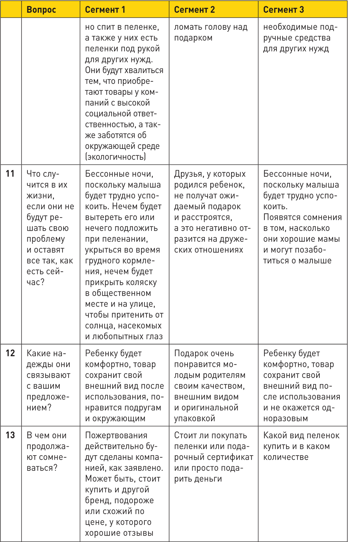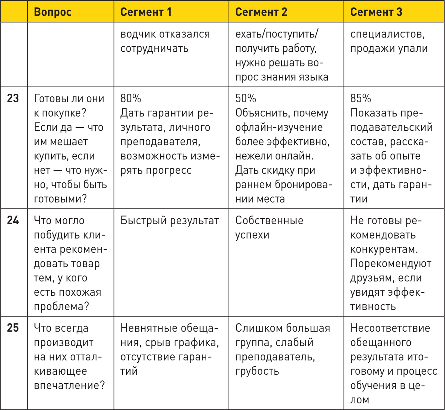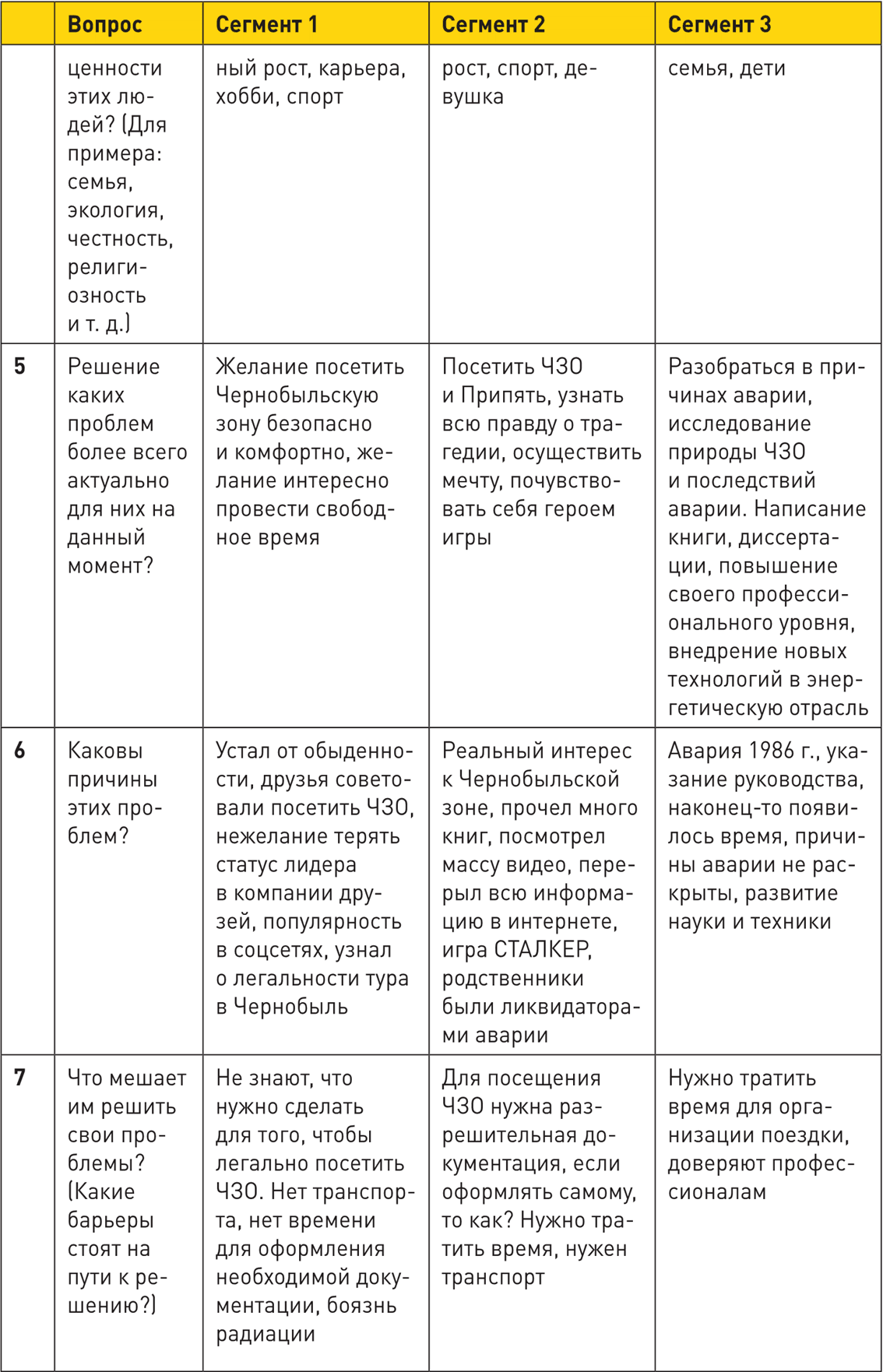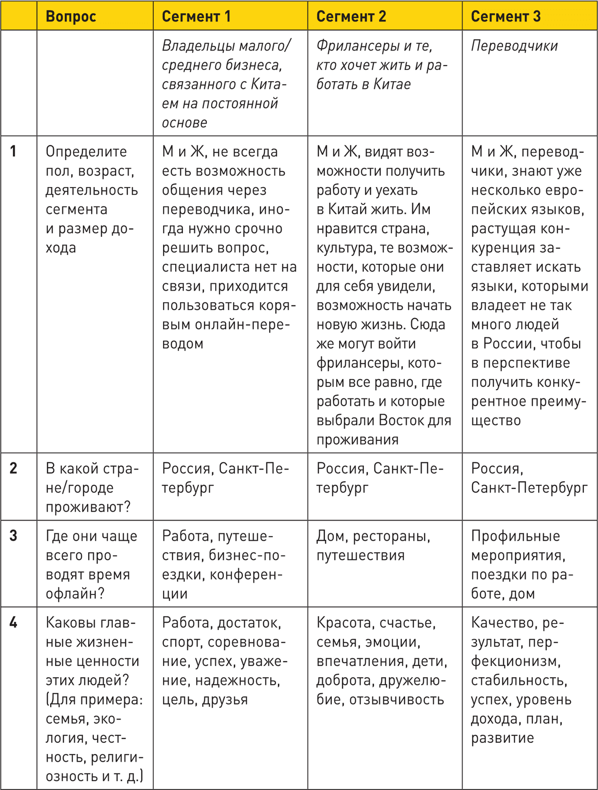 Категорически запрещается читать первый вопрос и по очереди отвечать на него в каждом из сегментов. Так вы не будете фокусироваться на их отличиях, и ответы получатся слишком общими. Вам необходимо прорабатывать все вопросы для каждого сегмента отдельно, идя по вертикали.