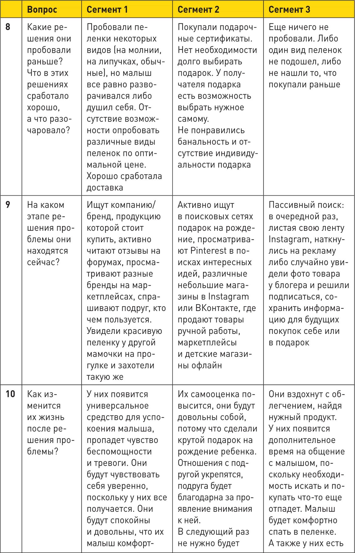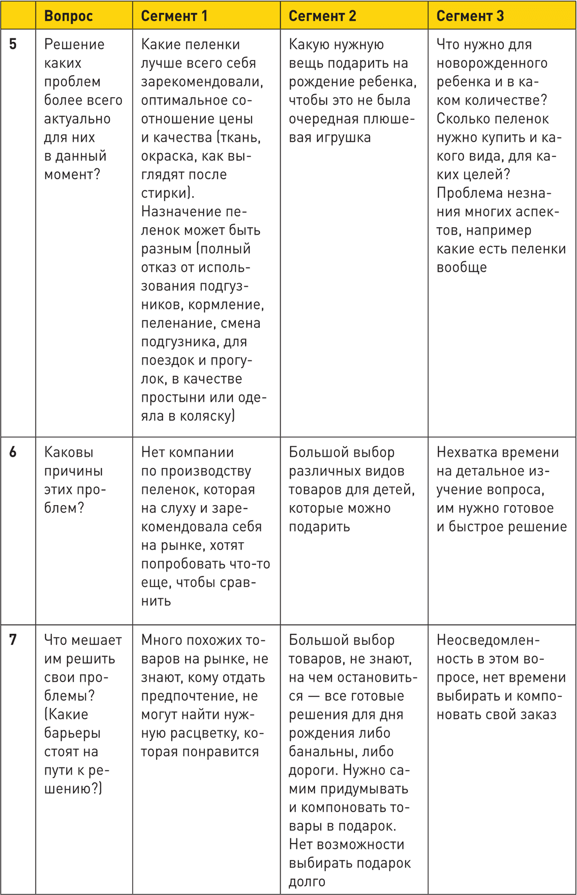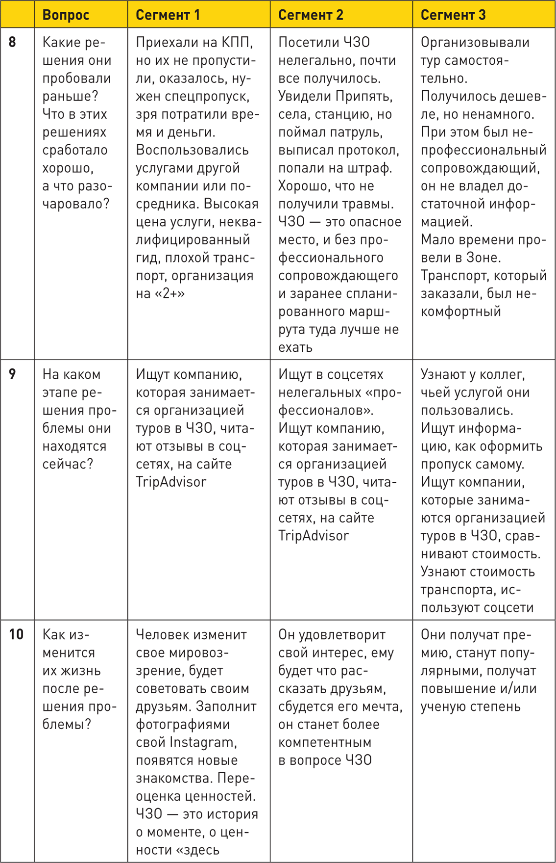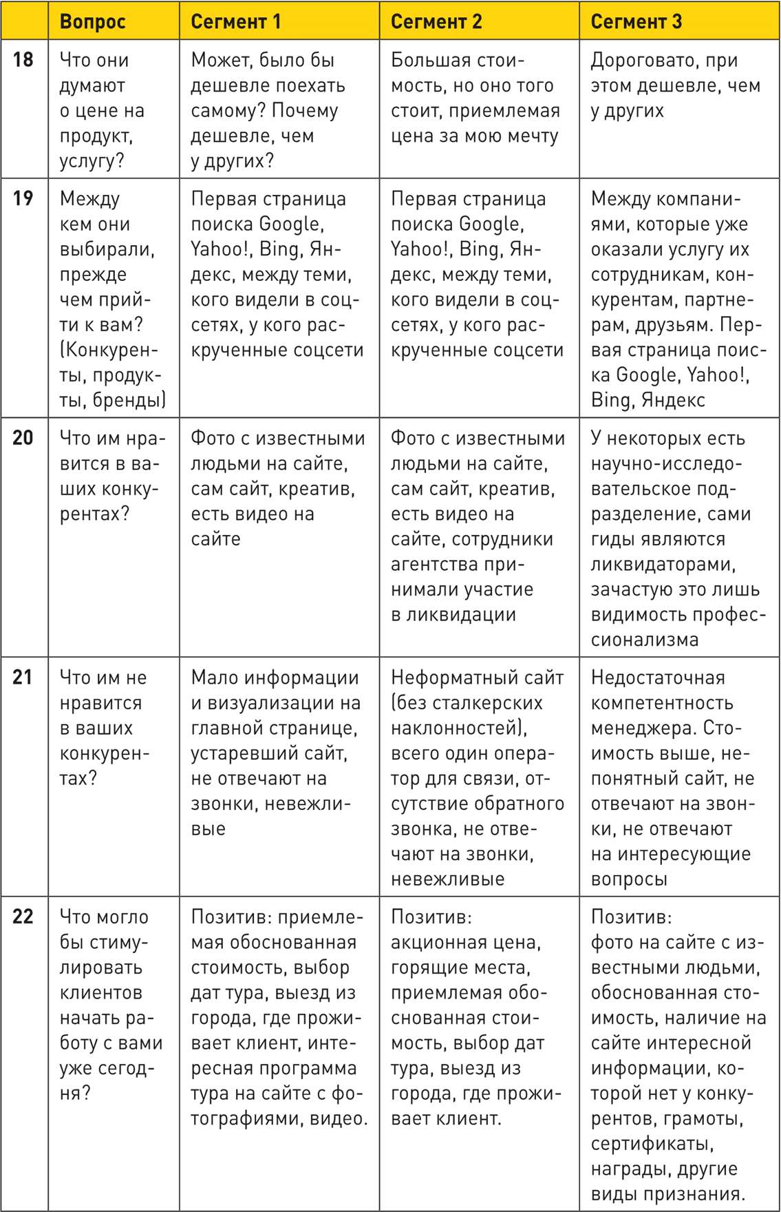 Категорически запрещается читать первый вопрос и по очереди отвечать на него в каждом из сегментов. Так вы не будете фокусироваться на их отличиях, и ответы получатся слишком общими. Вам необходимо прорабатывать все вопросы для каждого сегмента отдельно, идя по вертикали.