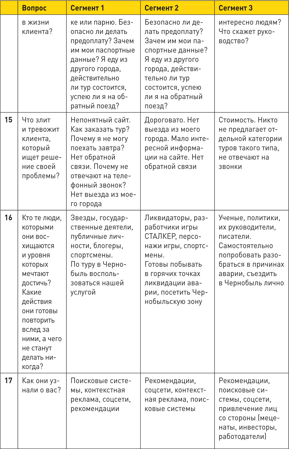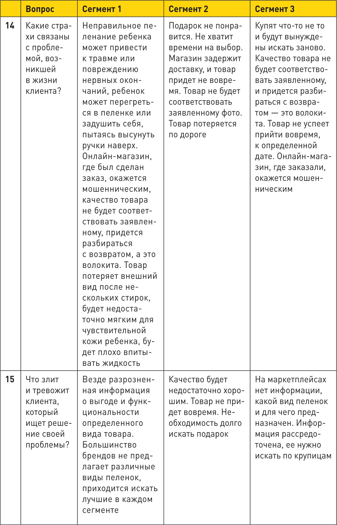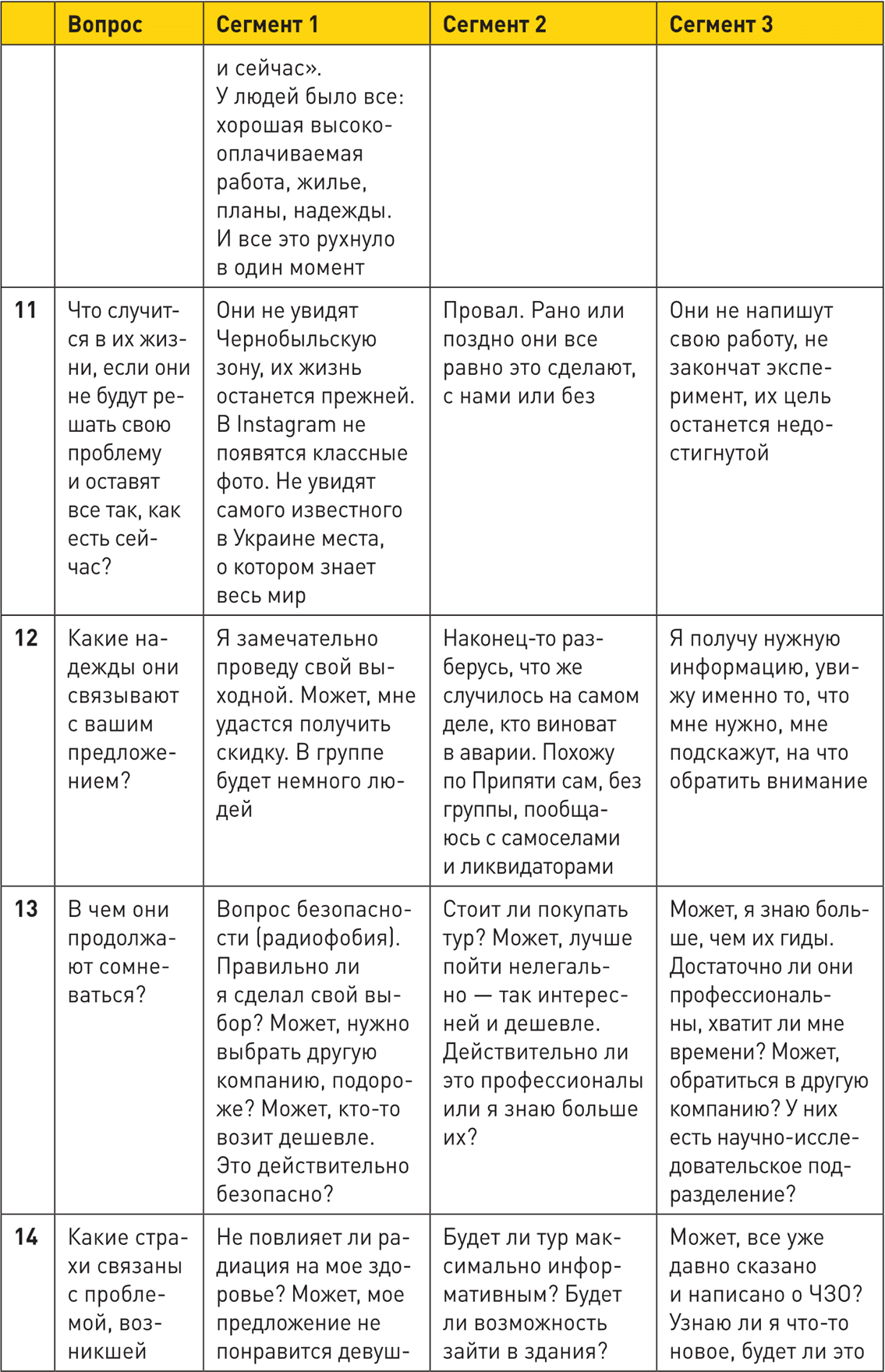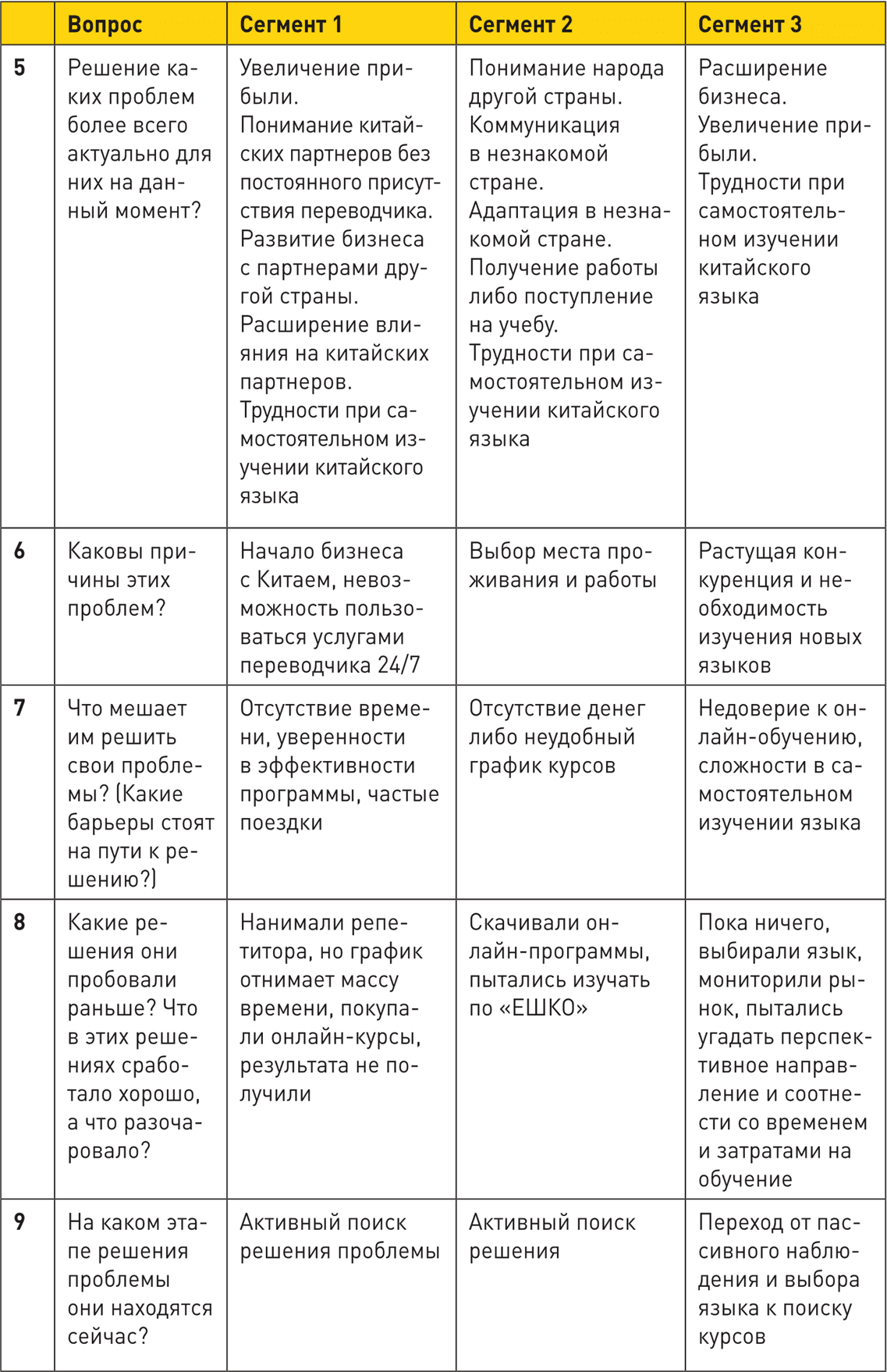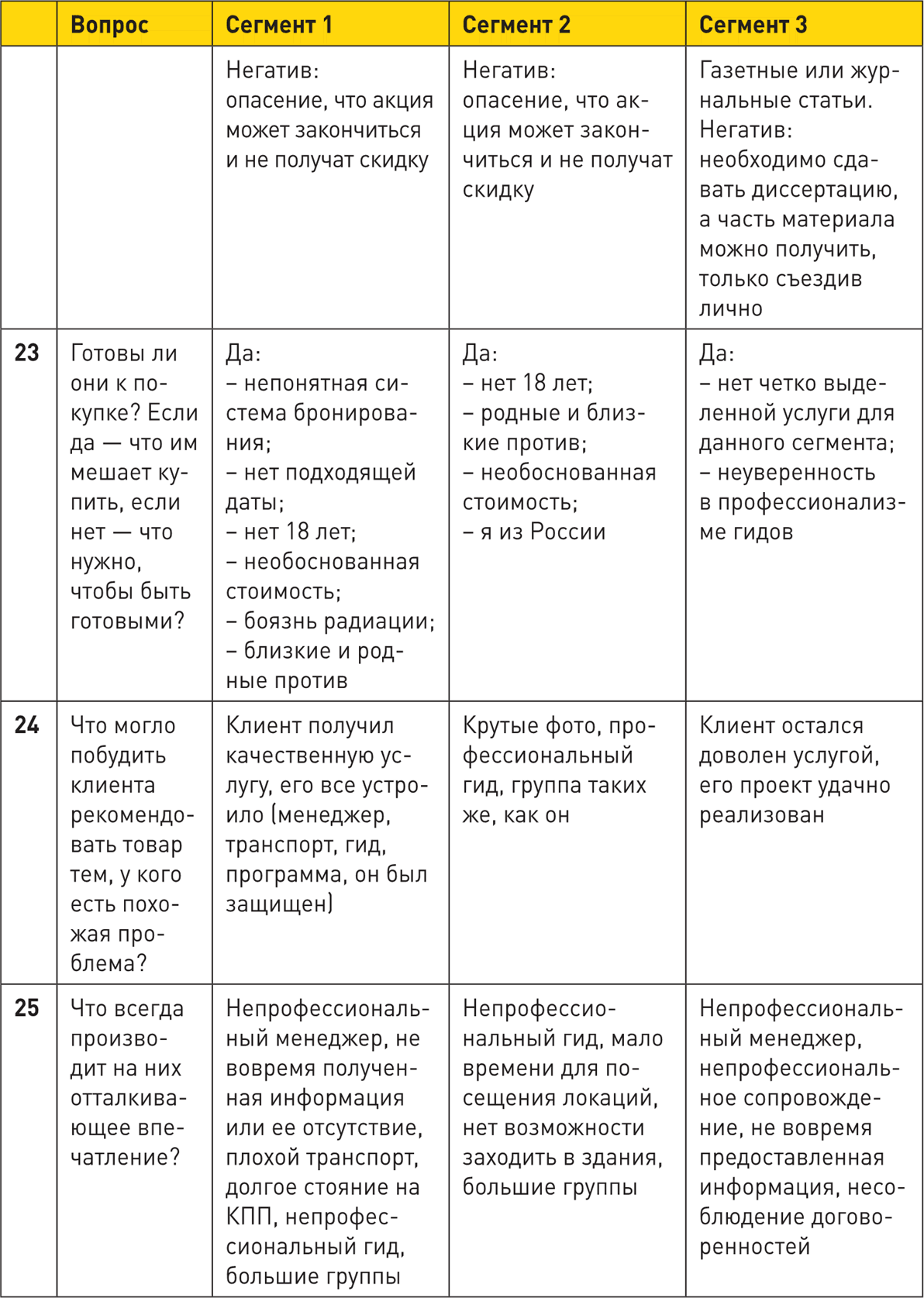 Категорически запрещается читать первый вопрос и по очереди отвечать на него в каждом из сегментов. Так вы не будете фокусироваться на их отличиях, и ответы получатся слишком общими. Вам необходимо прорабатывать все вопросы для каждого сегмента отдельно, идя по вертикали.