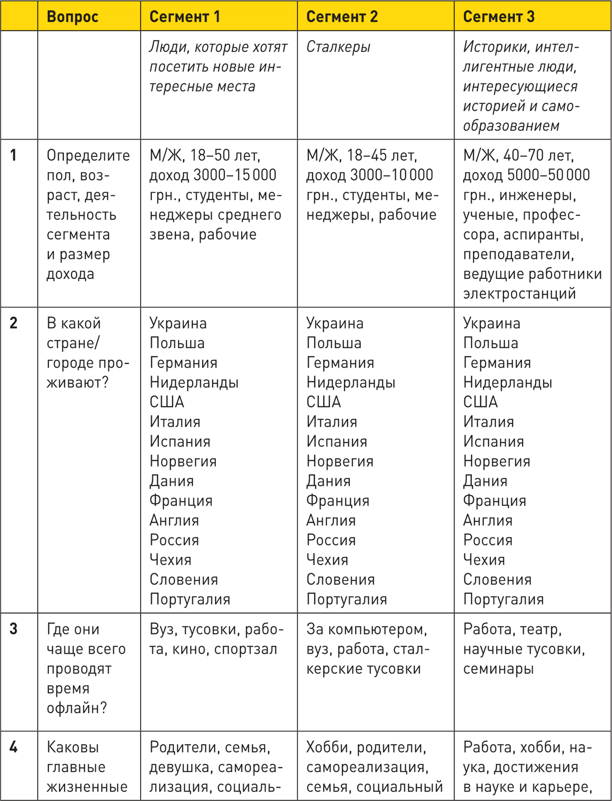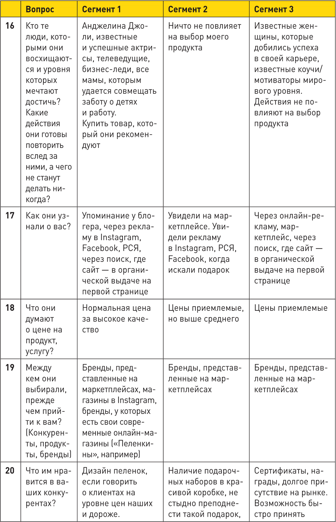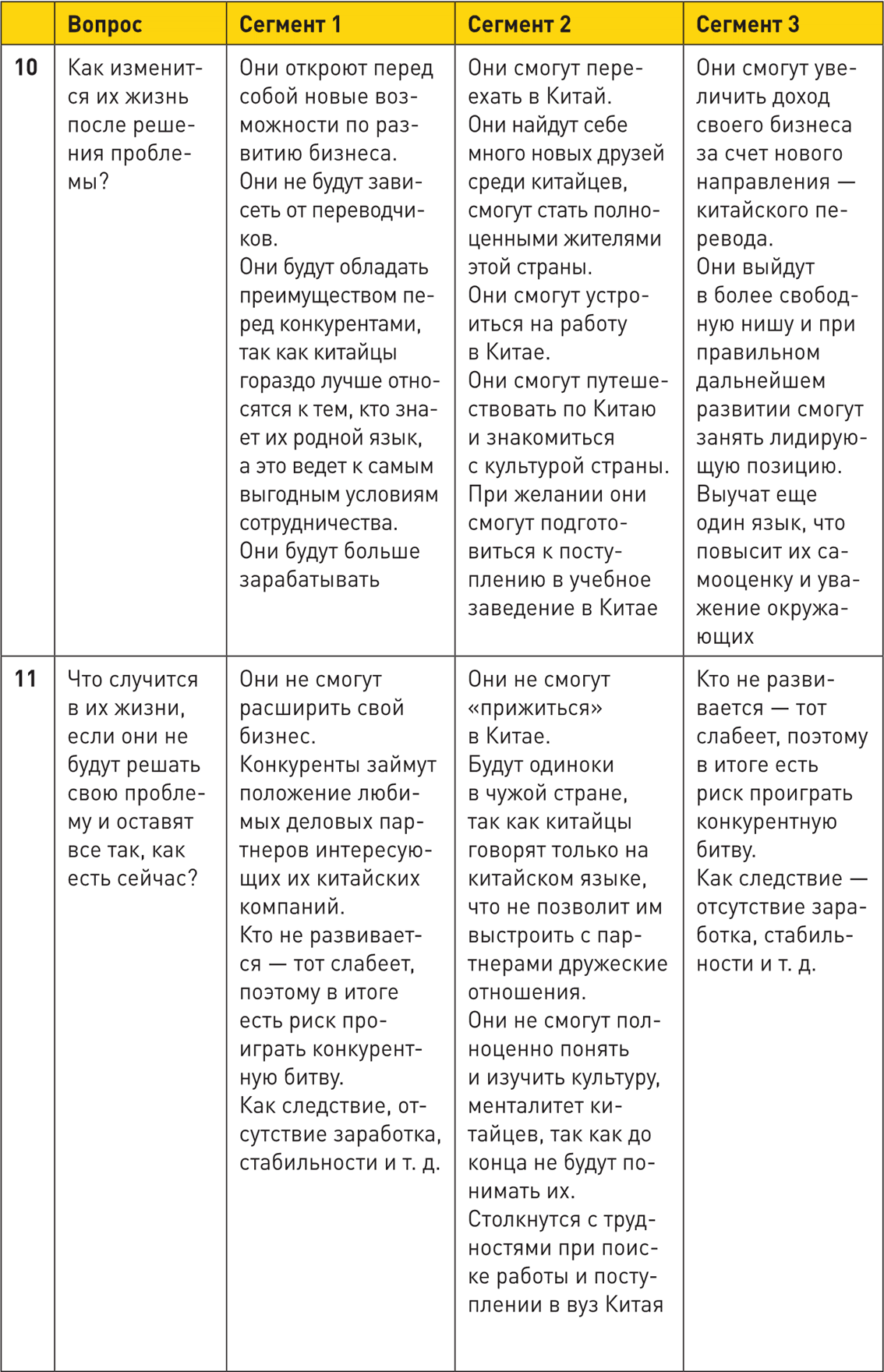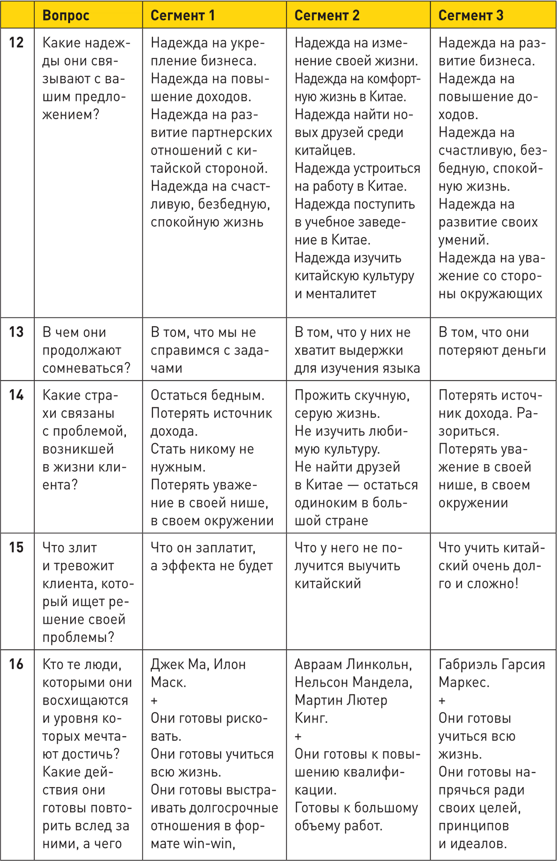 Категорически запрещается читать первый вопрос и по очереди отвечать на него в каждом из сегментов. Так вы не будете фокусироваться на их отличиях, и ответы получатся слишком общими. Вам необходимо прорабатывать все вопросы для каждого сегмента отдельно, идя по вертикали.