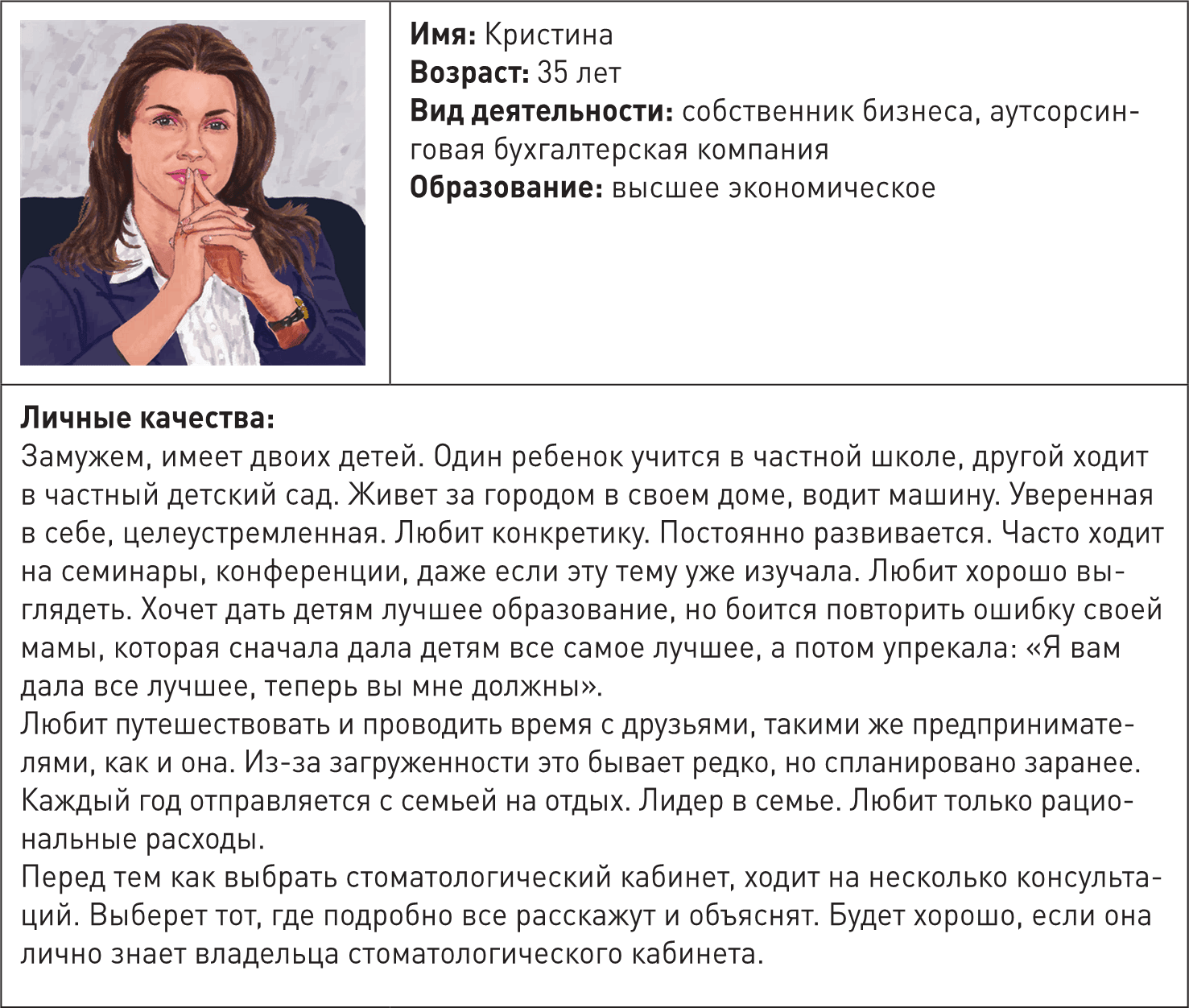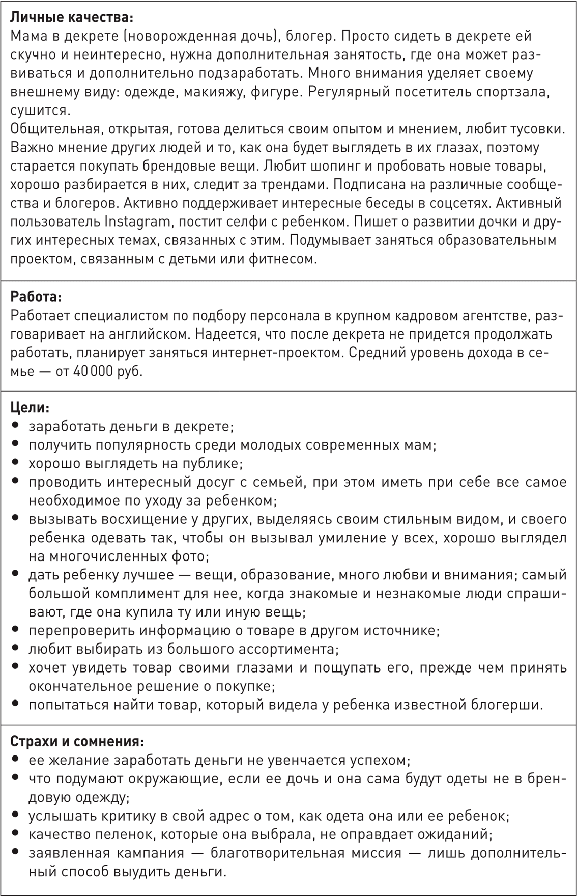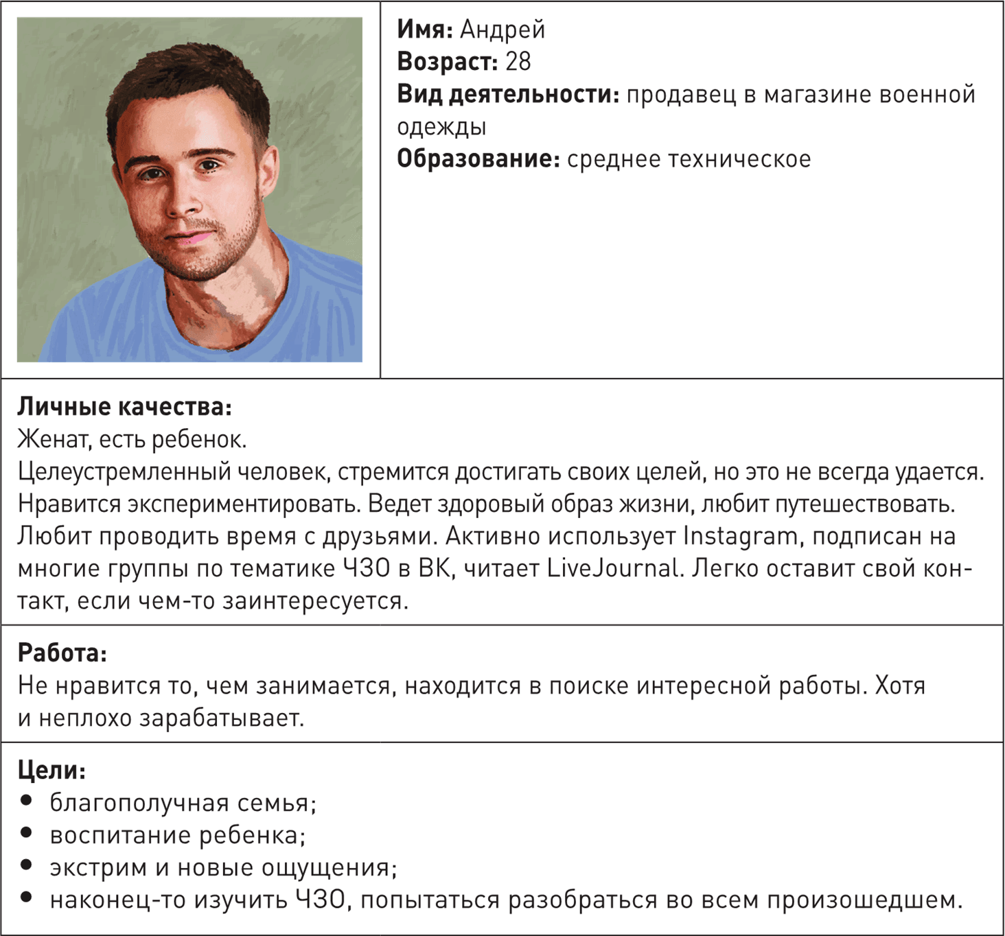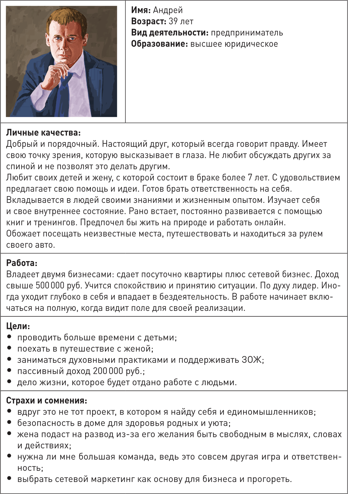 Правило 4. Не экономьте на деталях. Пишите с максимальным погружением, как если бы описывался человек, которого вы хорошо знаете – ваш друг или близкий родственник. Какой он по характеру? Есть ли у него семья, дети? Чем он живет, что для него важно? Где живет, на чем экономит, к чему стремится и т. д. Пусть это будет гипотеза, но зная своих клиентов или предполагая, каких людей вы хотите привлечь в свой бизнес, она станет жизнеспособной. В противном случае вам будет сложно использовать эти портреты.