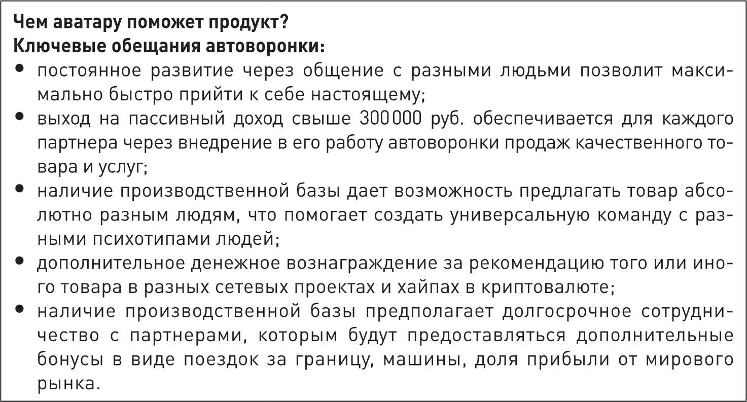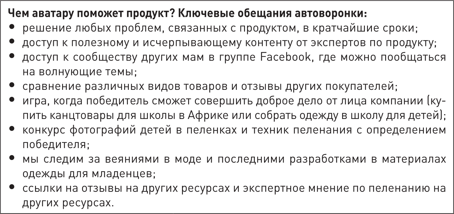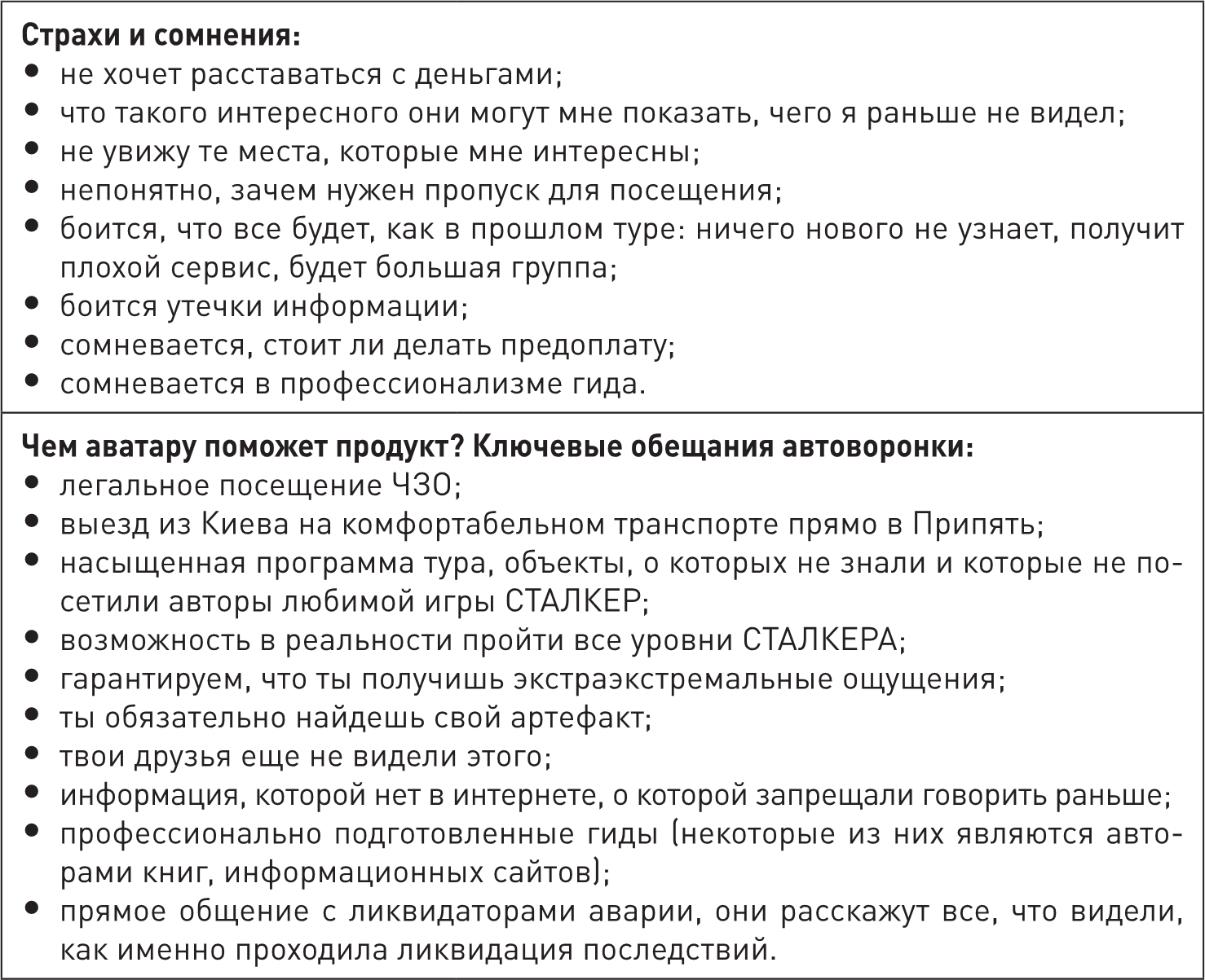 Правило 3. Акцент на ваш продукт. Все данные в блоках целей клиента, его страхов/сомнений, а также ключевые обещания автоворонки должны быть четко привязаны к продукту. Если вы продаете мебель, а у клиентки цель – выйти замуж, то к вашему аватару данная цель не относится. Вы можете ее прописать, но там также должны быть и цели, связанные с новым дизайном дома, комфортом, уютом – то есть всем тем, для чего приобретают мебель.