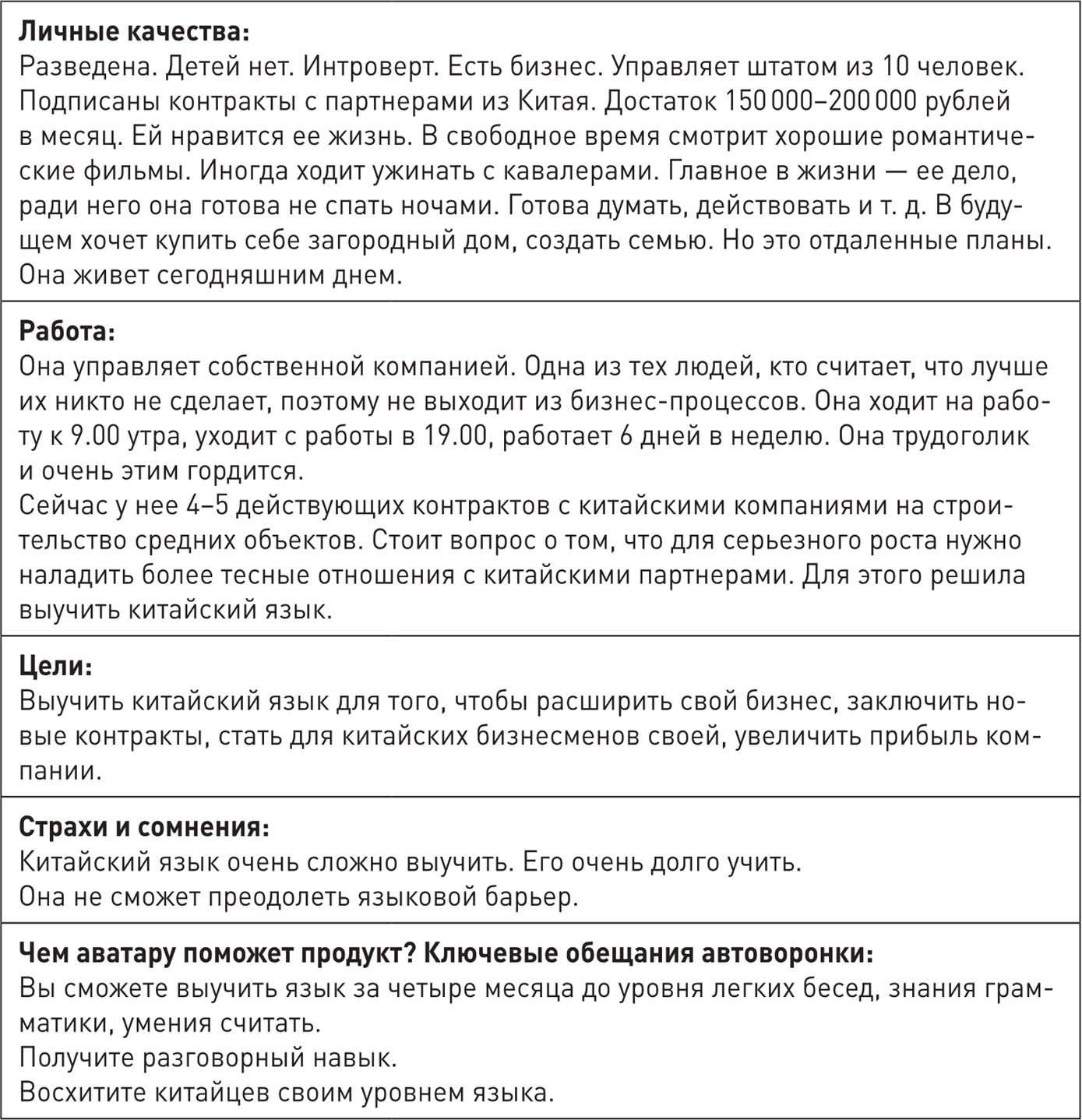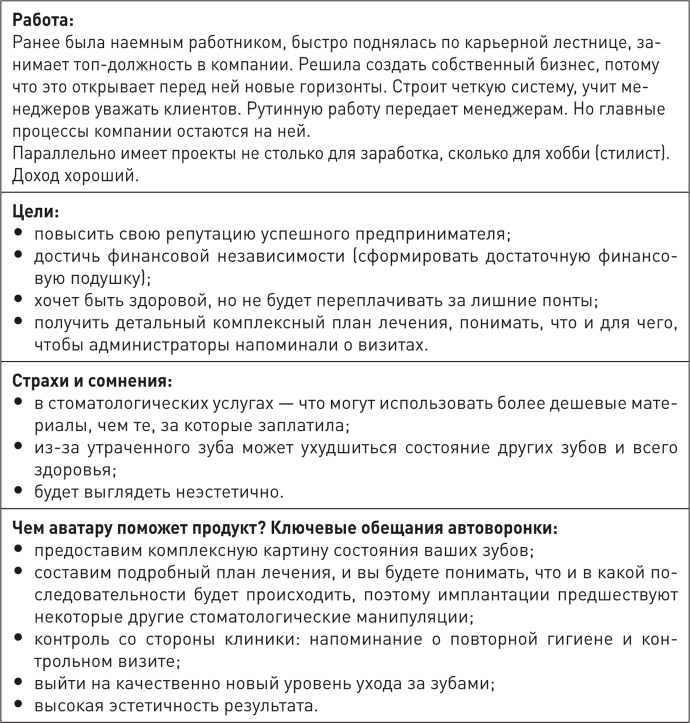 Правило 1. Используйте четкую структуру. Как ее составить, вы увидите ниже в примерах заполнения портретов аватаров. Это базовый вариант структуры, который содержит все необходимое для понимания клиента: имя, фото, возраст, вид деятельности, образование, личные качества, работа, цели, страхи и сомнения, ключевые обещания автоворонки. При желании вы можете нарастить эту структуру своими блоками.