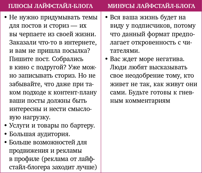 В лайфстайл-блоге делятся всем: что с вами происходит, о чем вы думаете, что планируете делать завтра. Однако мнение, что такие блоги обо всем и ни о чем, ошибочно! Лайфстайл-блог всегда имеет определенную тематику и постоянные рубрики. Каждый лайфстайл-блогер определяет для себя круг проблем, которые ему интересны и о которых он будет периодически писать. Например, это может быть спорт, секс, кулинария, техника, феминизм, дискриминация, ремонт, рисование. В целом возможности здесь безграничны.