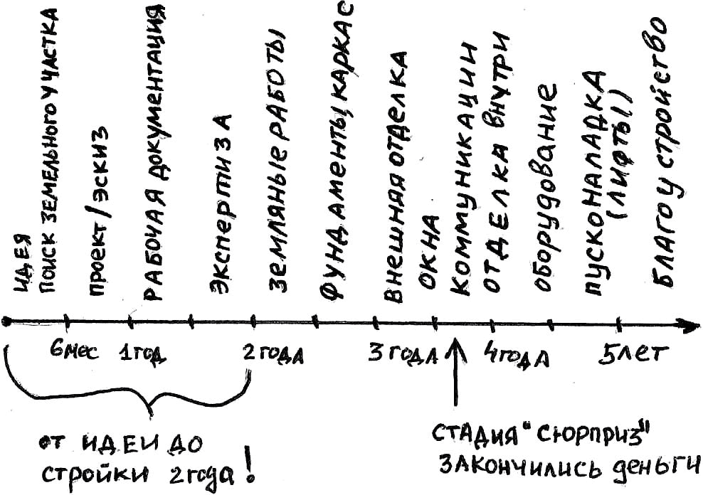 При этом деньги могут закончиться неожиданно и в любой момент времени, тогда все труды начальных этапов (проектирование) пропадут даром. Это сложно предугадать.
