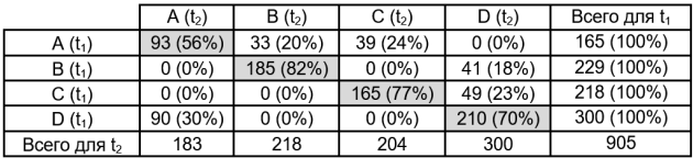 Диагональ таблицы определяет абсолютную величину и процент тех, кто остался верен любимой марке. Наивысший процент – у марки С. По этому показателю марка A выглядит не очень впечатляюще. Также остается большое 70% респондентов, которые так и не нашли "свою" марку.