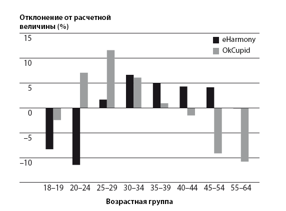 Для оценки эффективности действий eHarmony я повторил тот же набор манипуляций и сравнил процент от числа не состоящих в браке в США, относящихся географически к той или иной группе почтовых индексов по первым трем цифрам, с процентом пользователей eHarmony по этой группе индексов. Результаты показали незначительную степень отклонений в представительности той или иной географической группы в сторону превышения либо отставания. Как бы то ни было, есть небольшое превышение по числу пользователей eHarmony в районах с малой численностью населения. Из этого следует, что eHarmony предлагает реальные социальные решения, помогая людям знакомиться в тех районах, где это было бы в иной ситуации затруднительно.