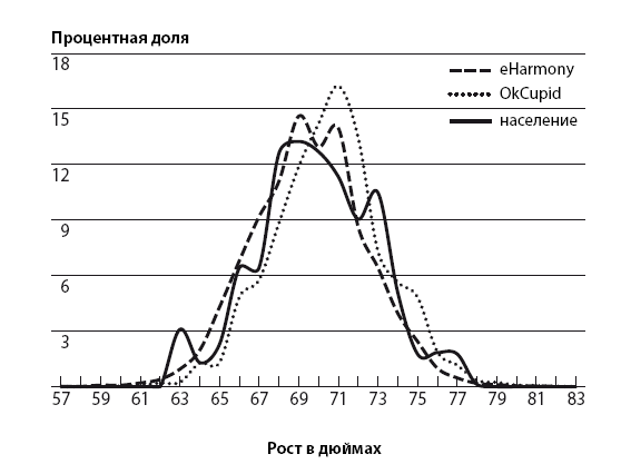 Я повторил то же сравнительное упражнение применительно к распределению по возрасту и росту пользователей на двух данных сайтах. Что касается возраста, я рассчитал, сколько не состоящих в браке относятся к той или иной возрастной группе в процентах к общему числу не состоящих в браке в США в возрасте до 65 лет, по данным переписи 2010 года. Затем для каждого из двух сайтов я рассчитал количество пользователей в тех же возрастных рамках на сайте в процентах к количеству пользователей моложе 65 лет и затем вычел процентный показатель по населению в целом из процентных результатов по сайтам. Как видно из рисунка 3.1, я выяснил, что OkCupid привлекает значительно больше 20–39-летних по сравнению с ожидаемой пропорцией по совокупности населения, но тех, кому за сорок, оказывается намного меньше, чем в пропорции к населению в целом. Напротив, eHarmony не очень популярен у 20–24-летних. Зато в более старших возрастных группах достигается значительно более равномерное распределение.