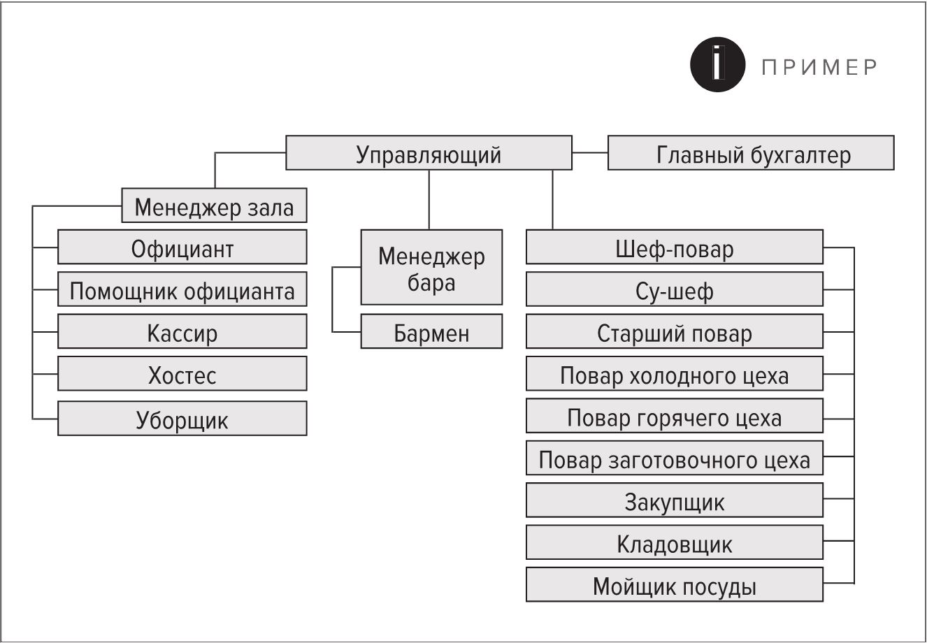 Организационная структура и штатное расписание формируются в зависимости от концепции предприятия. Состав и количество сотрудников могут варьироваться в зависимости от специфики ресторана.