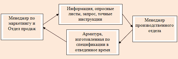 С другой стороны неполучение ясных инструкций, незаполнение полностью всех данных в опросном листе арматуры может приводить к недопониманию между подразделениями. Менеджер по производству не может начать Выполнение заказа, пока нет ясности, ведь в случае неподтверждения заказчиком спецификации произведенная арматура окажется браком. Затраты на получение информации от заказчика могут не соответствовать возможностям менеджера по маркетингу, и тогда Выполнение заказа и процесс обмена ставится под угрозу. Качество внутренних взаимоотношений напрямую начинает влиять на качество отношений с внешним заказчиком.