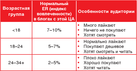 В среднем у блогеров с аудиторией 18–25 лет ER составляет сейчас 5–7 %. То есть если у блогера 100 000 подписчиков и его основная аудитория – 18–25, то в норме у него под фото будет 5 000–7 000 лайков.