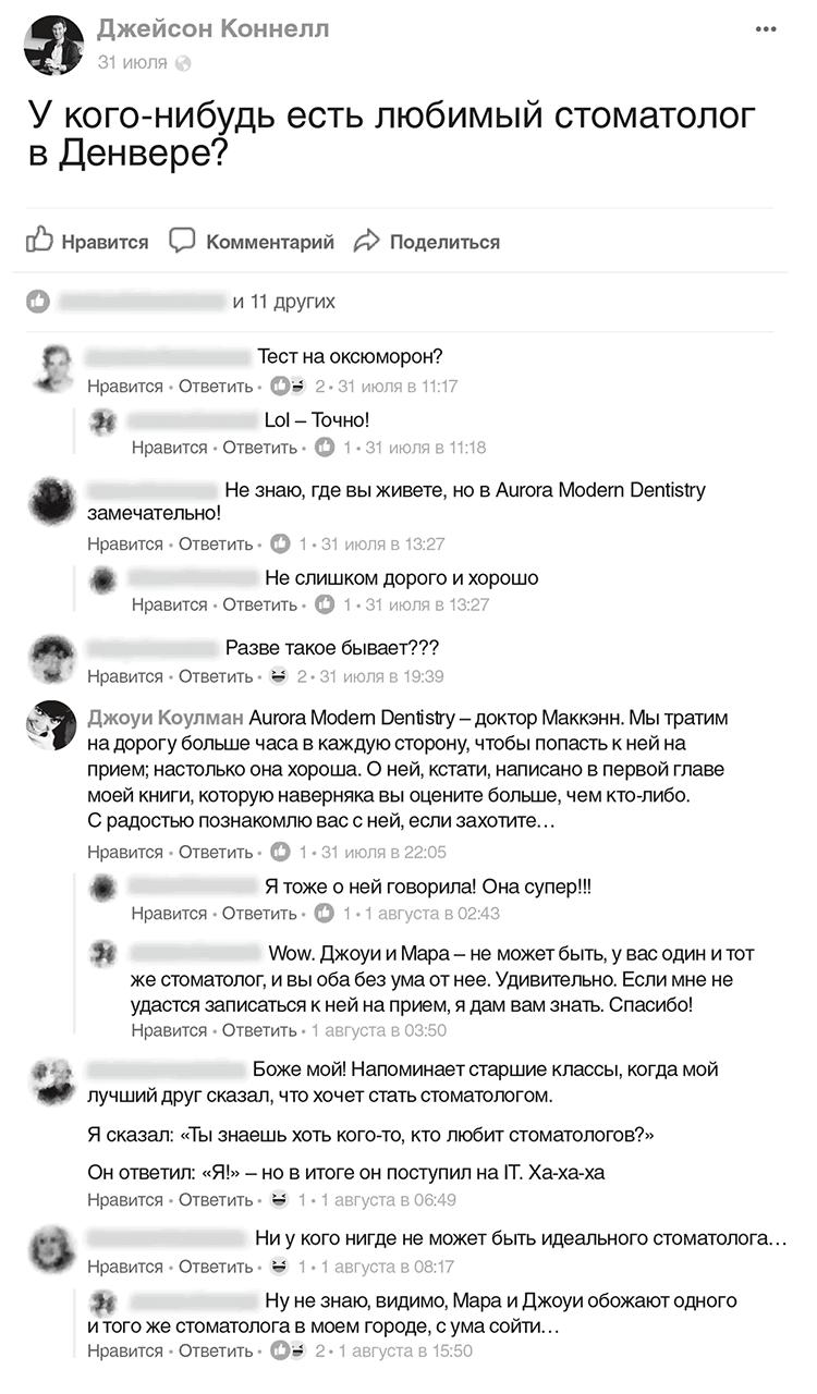 Недавняя переписка на Facebook показала, как быстро расходятся слухи и насколько ваша компания опередит конкурентов, если вы последуете советам из этой книги. Кто любит своего стоматолога? Не только я. Другим тоже нравится доктор Маккэнн.