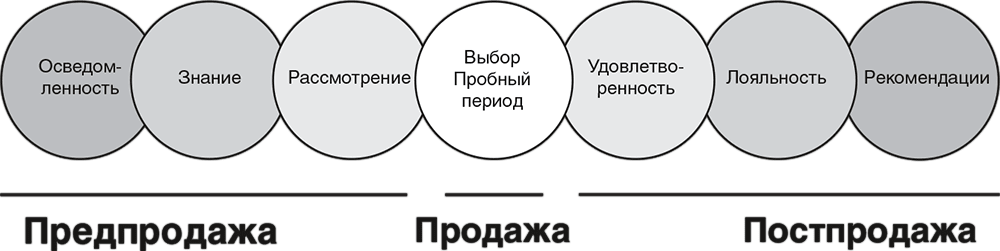 Эти результаты дают соотношение 43:1, если говорить о приоритете предпродаж по сравнению с постпродажами. Для большей наглядности взгляните на иллюстрацию жизненного цикла клиента: