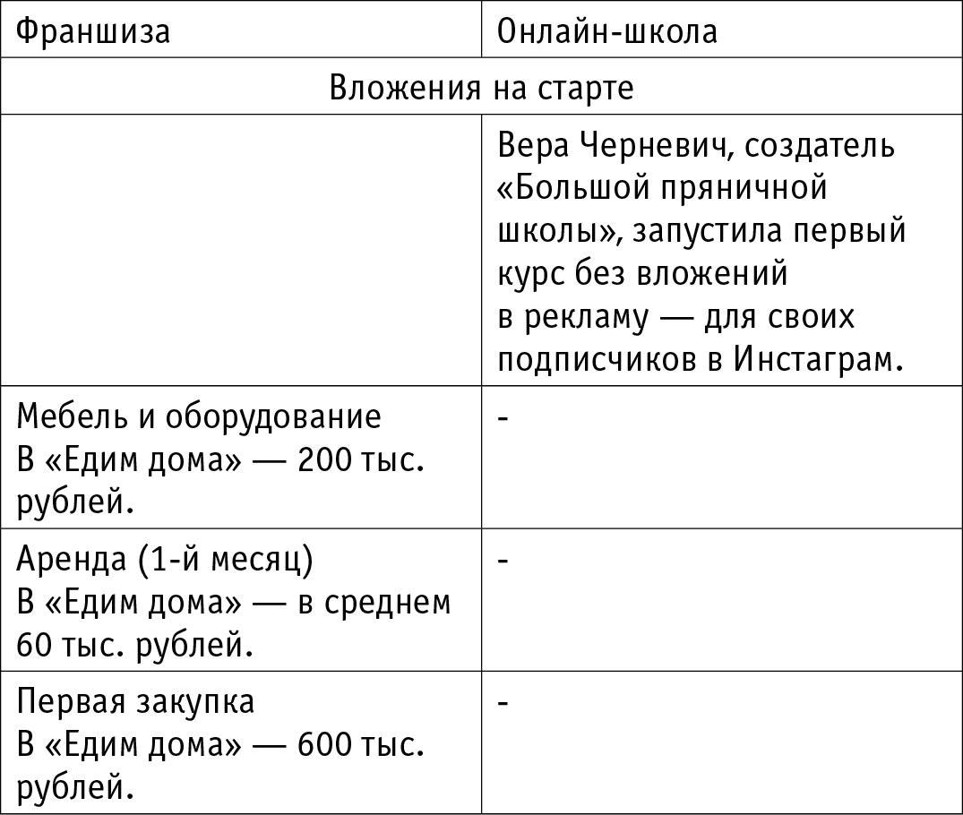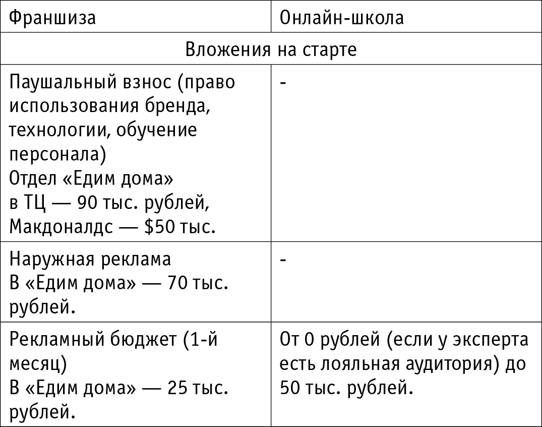 Для того чтобы открыть отдел товаров для «Едим дома» площадью 20 м?, нужны начальные инвестиции около 1 млн рублей, а для Макдоналдса – примерно 1$ млн. Онлайн-школу можно открыть даже без инвестиций, если грамотно работать с аудиторией эксперта и использовать тестовые версии службы рассылки и образовательной платформы, бесплатные конструкторы лендингов и т. п.