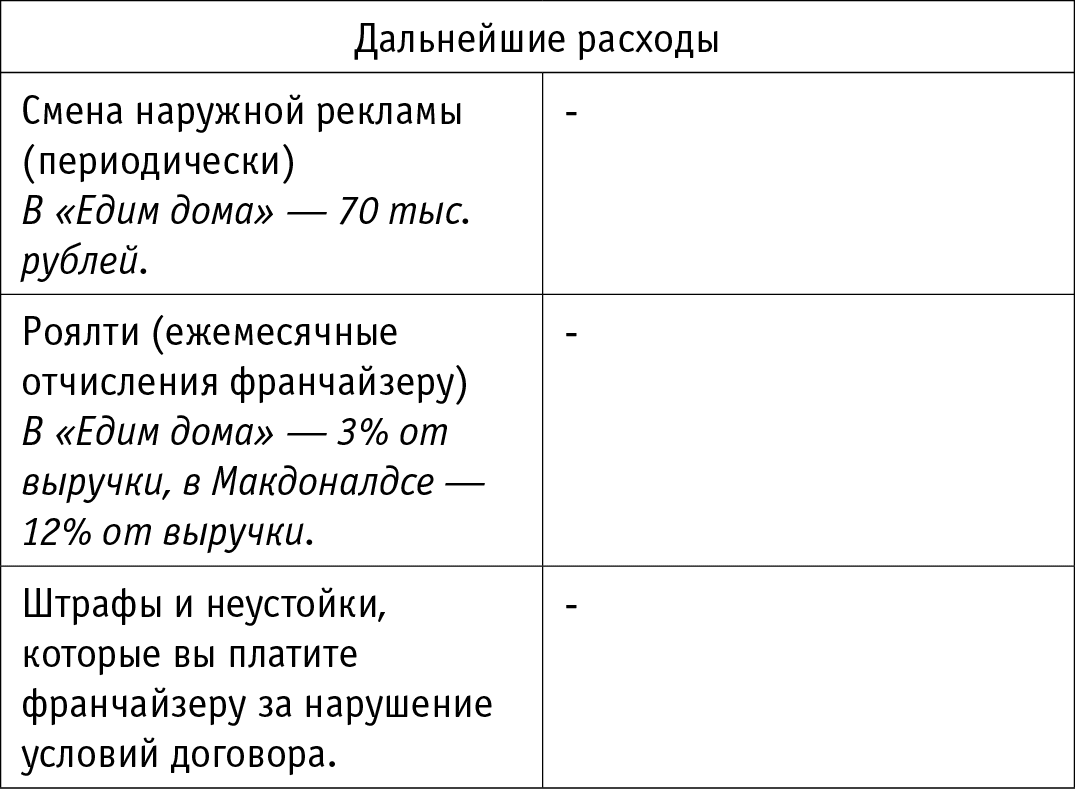 Франшиза – финансовое рабство. Вы платите роялти в течение всего срока ее использования. Франчайзер постоянно диктует расходы на рекламу вне зависимости от размера ваших доходов.