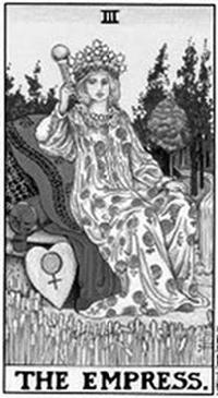Императрица сидит в плодоносном саду, в ногах ее колосится пшеница, за спиной ее лес, ручей. Сама она сидит на мягком троне в шикарном платье, с богатой короной на голове. В руках у нее скипетр как символ власти. Сбоку стоит щит в форме сердца, который связывает ее со знаком Венеры. Императрица меняет образ Великой Жрицы и становится Великой Матерью.