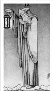 Невооруженным взглядом видно, что Отшельник одинок. Этот человек отрешен от мира, но его это не тяготит, это его естественное состояние. Этот пожилой человек здесь выступает как учитель. Он систематизировал знания Жрицы, облек их в новую форму, он постиг эти знания. Отшельник живет прошлым, он обращен в прошлое.
