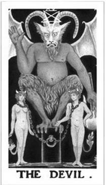 Они за шею прикованы цепями к железному кольцу у Алтаря. Здесь, конечно, просматривается аналогия с шестой картой «Влюбленные», но только теперь у мужчины и женщины на голове присутствуют рога и хвосты.