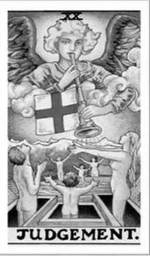 На карте нет настроения удрученности. Люди смотрят на ангела с благоволением. Женщина протягивает к нему руки в умиротворении. Создается ощущение того, что люди наконец-то рады услышать трубный глас и надеются на лучшее. Фигуры людей буквально охвачены восхищением. Сама по себе карта не вызывает страшной аналогии с апокалипсисом.