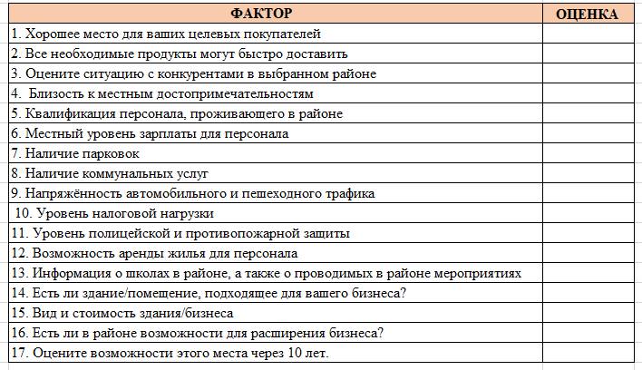 Используйте этот метод для определения рейтинга для возможного расположения вашего заведения. Наша оценка: "A" = отличный,"B" = хороший,"C" = средний и «D» = плохой.