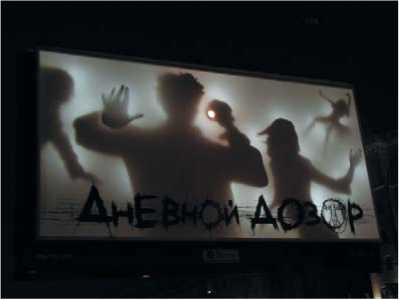 На илл.1.4. представлена реклама, оригинальным образом обыгрывающая особенности светового короба. Днем на белой поверхности видно только название фильма. Но в темное время суток на подсвечиваемой изнутри поверхности начинают появляться тени.