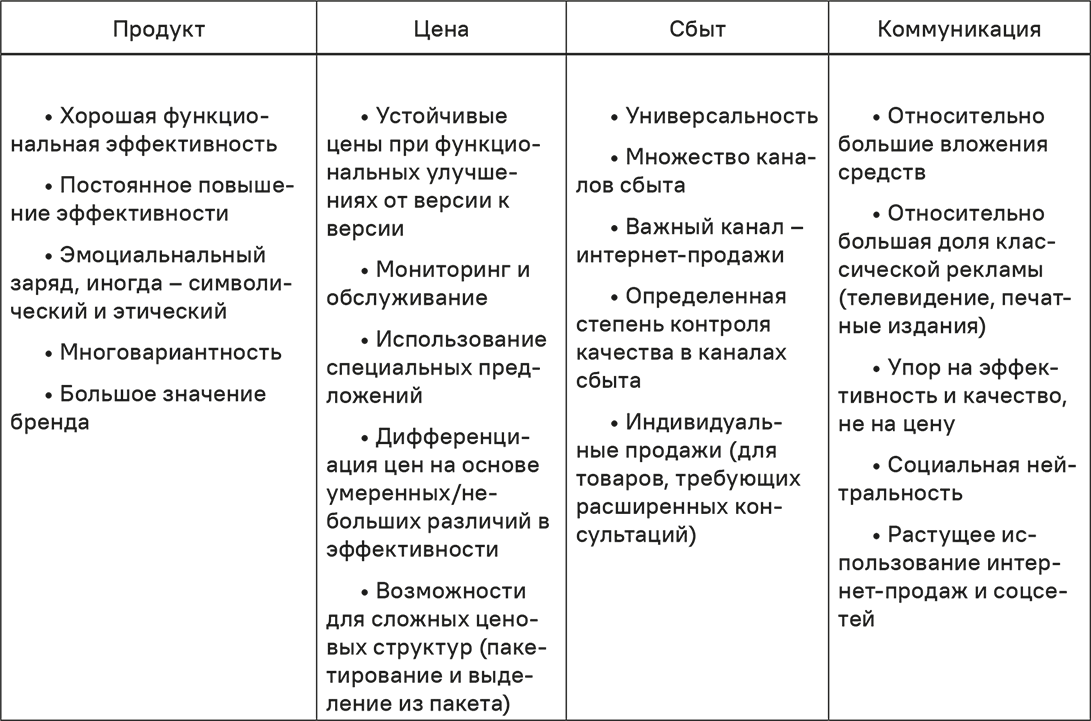 Кроме того, среднеценовая позиция необязательно ассоциируется с понятием «срединный тупик» с плохими прибылями. Cronshaw et al. [65] выяснили, что компании в среднеценовом сегменте показывают лучшую результативность, чем в низкоценовом. Sharp and Dawes [66] отмечают, что многие компании и бренды в среднеценовом сегменте демонстрируют устойчивые успехи выше среднего. Среди примеров – Toyota (автомобили), LG (электроника), Dove (косметика), Best Western (гостиницы), Pepsi (прохладительные напитки и закуски) и Kellogg (продукты для завтраков).