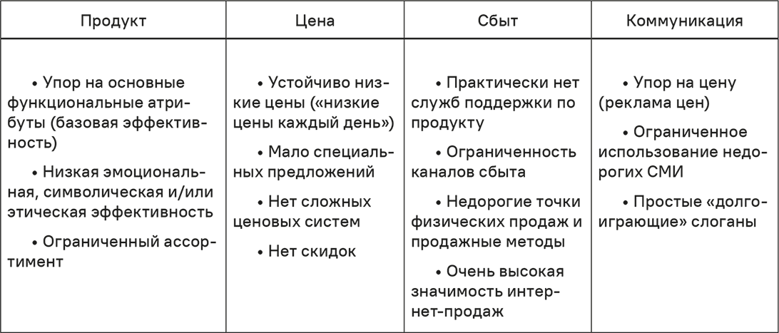 Продавцы низкоценовых товаров стараются не предлагать ничего сверх этого. Они избегают излишества в функциональных атрибутах и не пытаются удовлетворять дополнительные эмоциональные, символические или этические потребности, особенно если это требует добавочных издержек или любого рода усложнения.