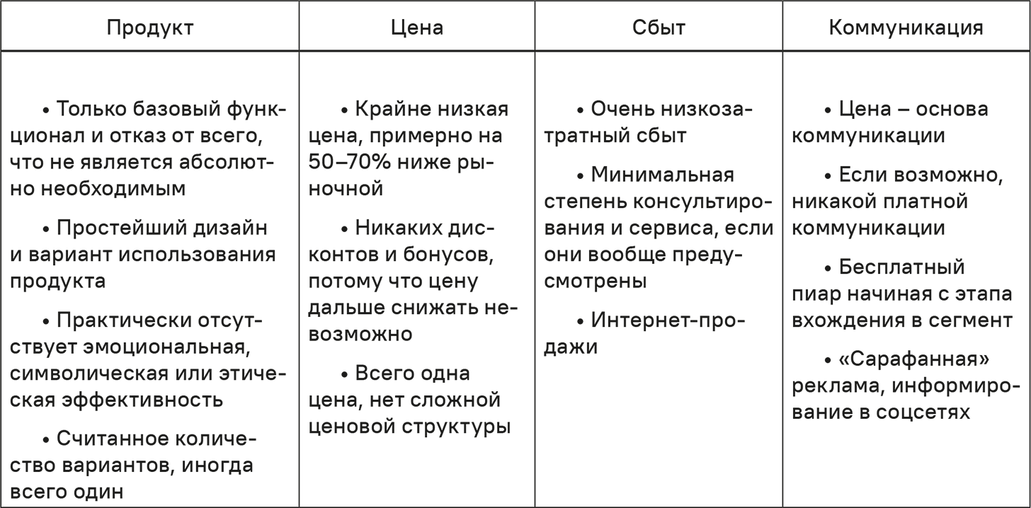 Главный вызов стратегии сверхнизких цен кроется в создании такой потребительской ценности, которую бы сочло приемлемой достаточное число потребителей и которая при этом позволила бы кардинально минимизировать затраты.
